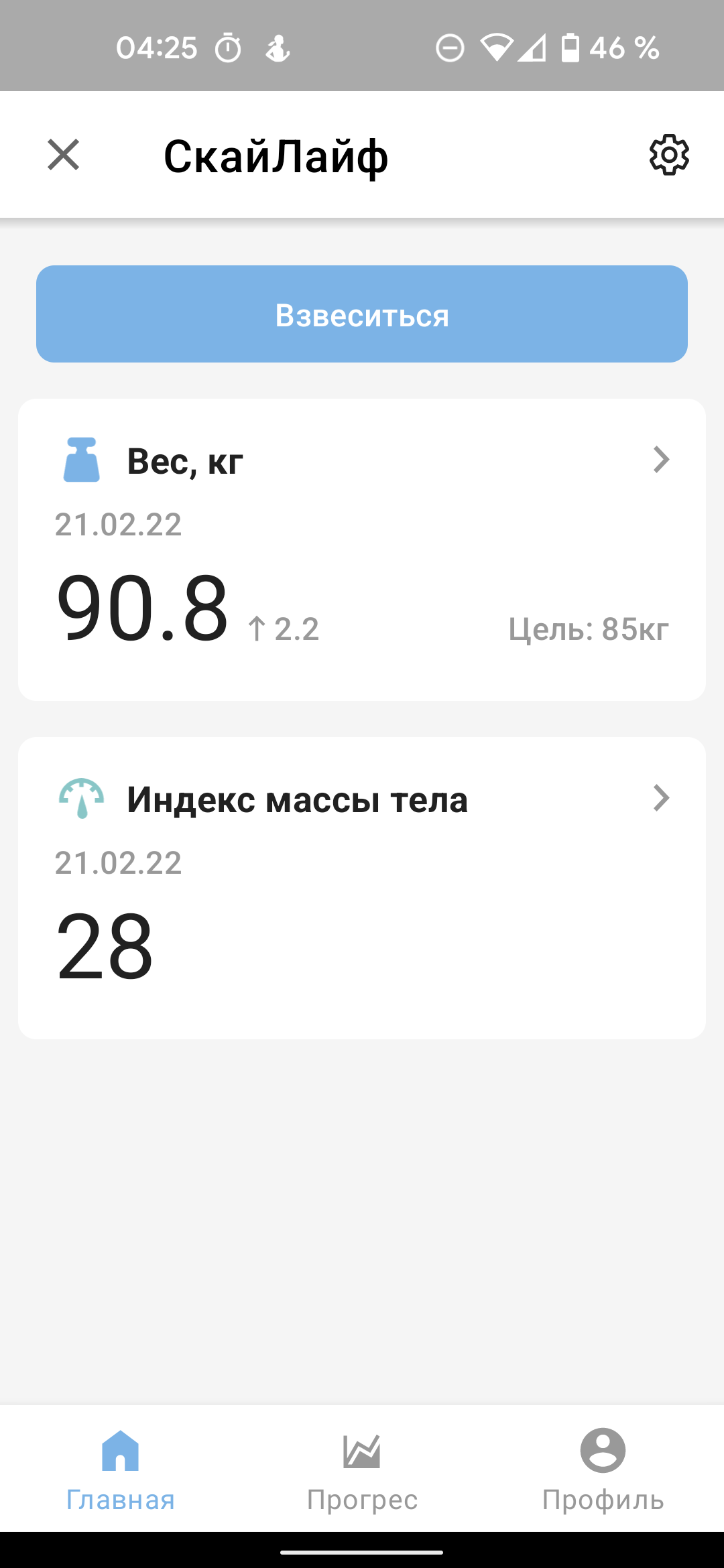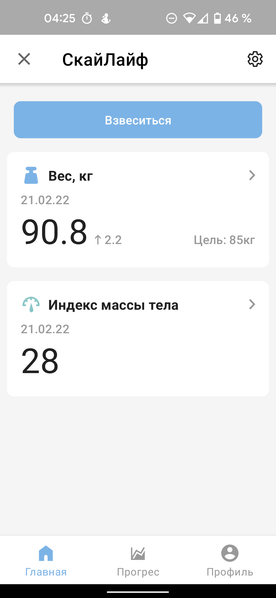 На главной странице Скайлайф мы видим текущий и целевой вес пользователя и автоматически вычисляемый ИМТ — индекс массы тела. Здесь могут выводиться также содержание в организме воды, вес жира, мышц и костей, но у SkyBalance RS-762S нет сенсоров, анализирующих все эти параметры.
