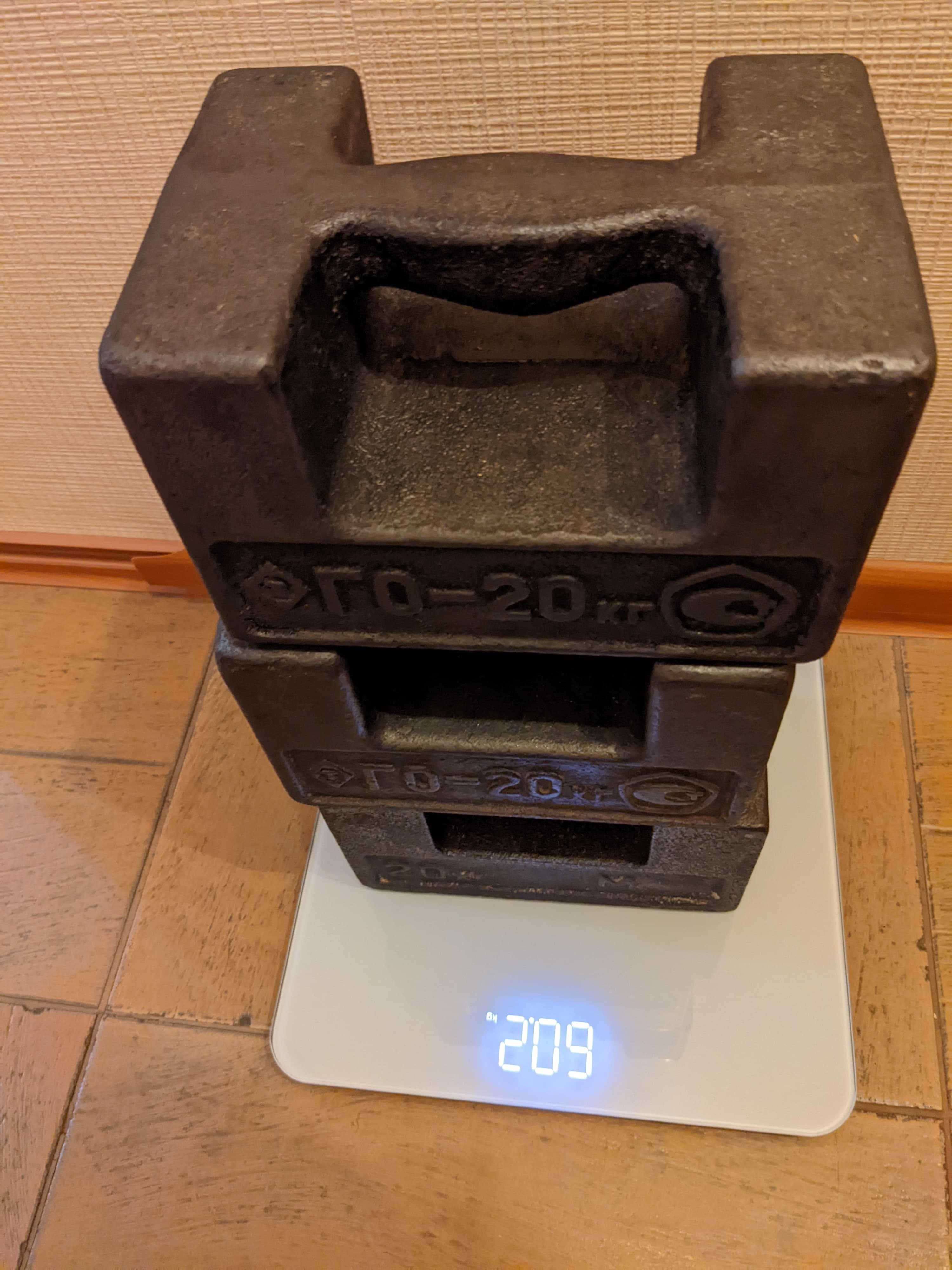 Чтобы оценить правильность показаний, мы воспользовались тремя 20-килограммовыми поверочными гирями класса точности М1 и набором лабораторных разновесов 4-го класса точности массой от 100 до 500 г.