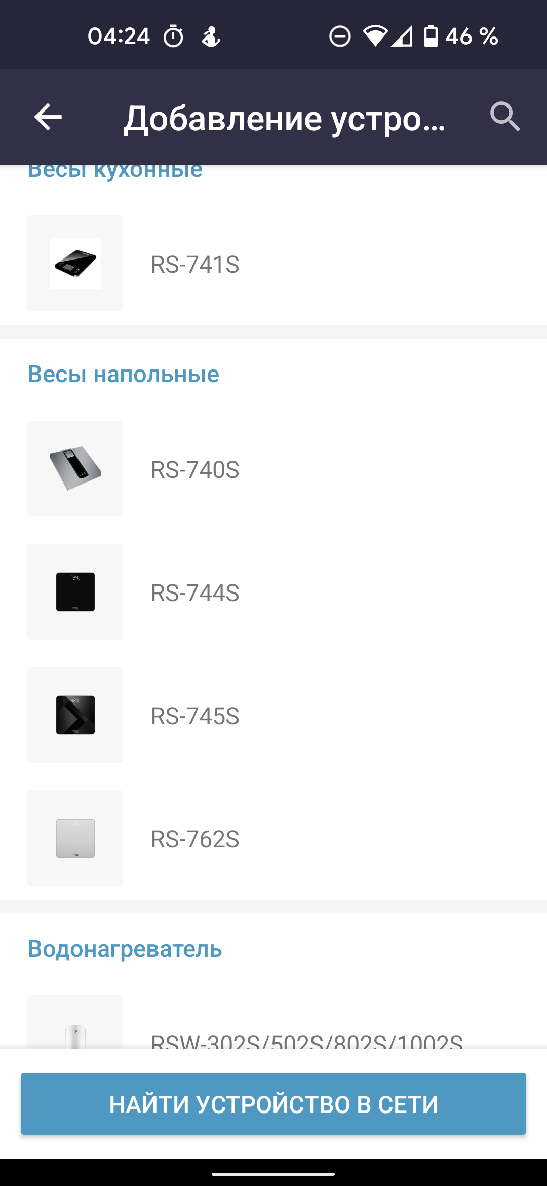 Для добавления нового устройства следует нажать на «+» в верхнем правом углу экрана. Наша модель управляется по Bluetooth, так что этот беспроводной интерфейс надо будет включить на телефоне. И не забыть, что приложению требуется разрешение на доступ к данным о местоположении. Затем следует воспользоваться кнопкой «найти устройство в сети» или выбрать нужную модель из предлагаемого списка.