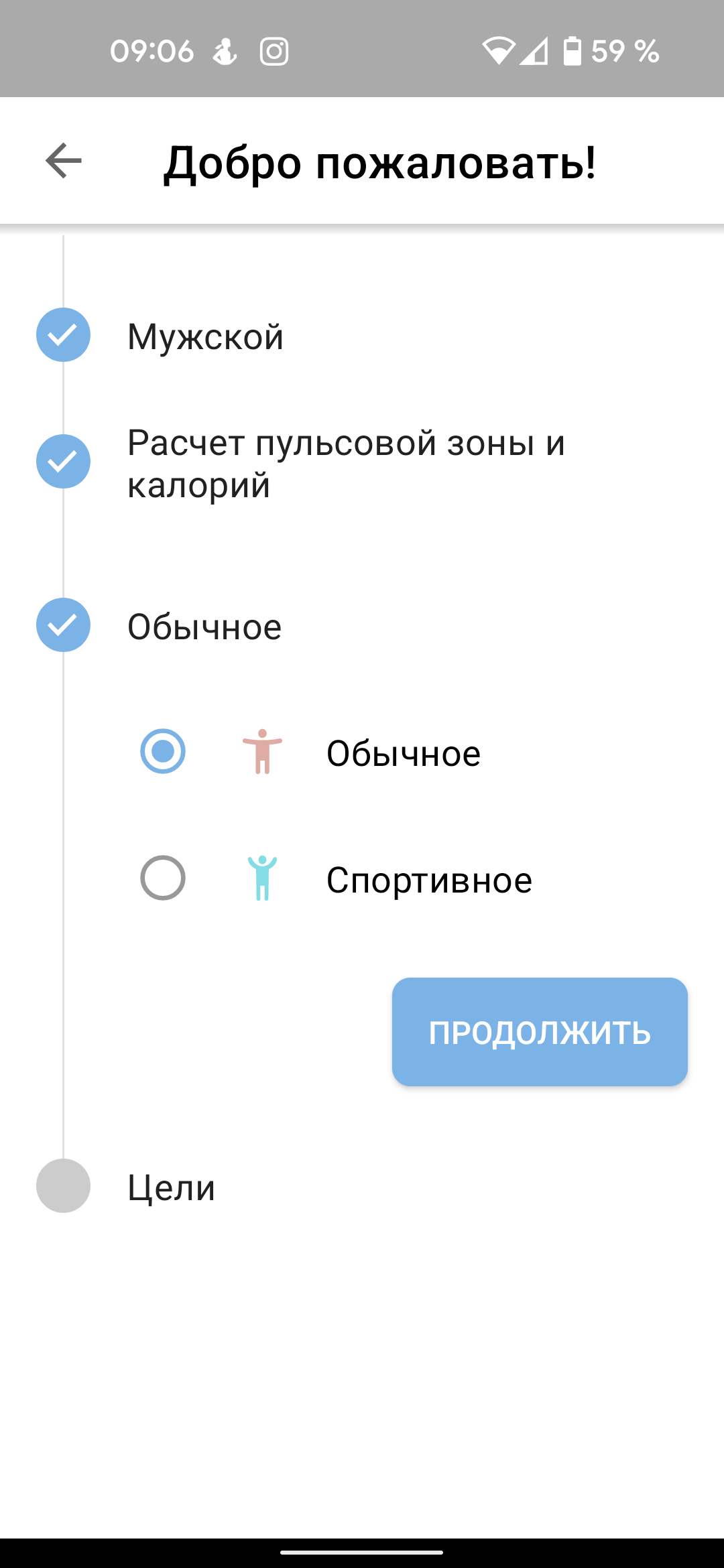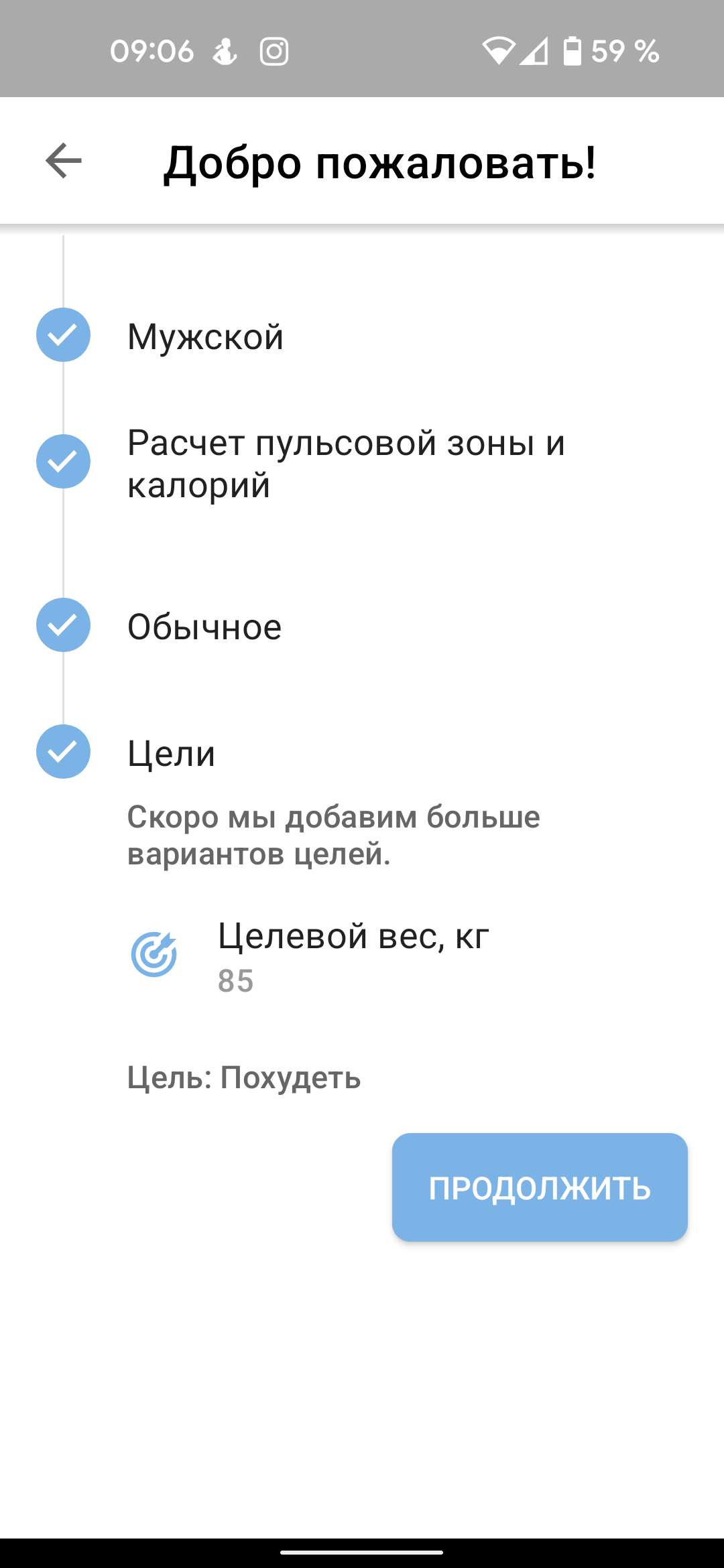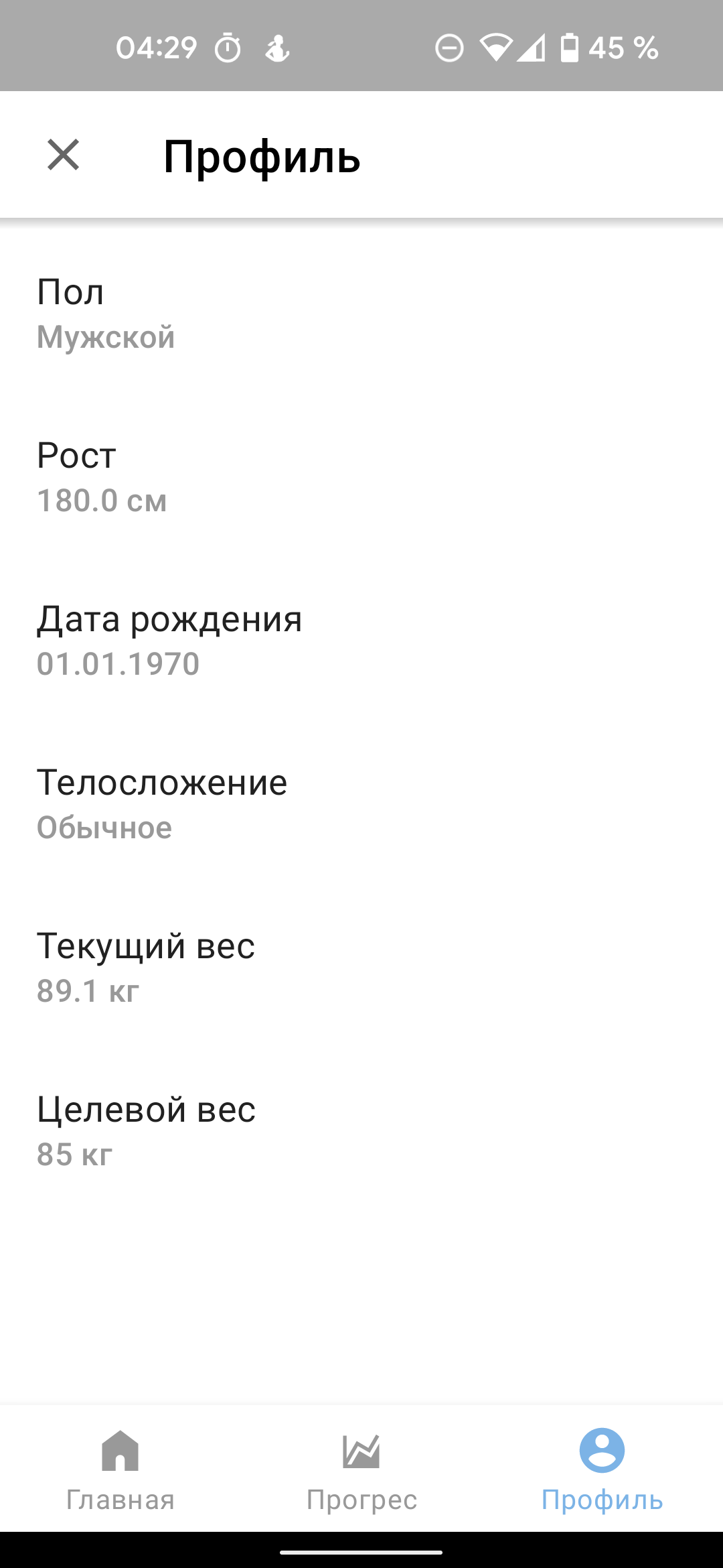 При первом знакомстве трекер предлагает пользователю ввести данные о росте, возрасте, телосложении и целевом весе. Эти данные нужны для правильного расчета индекса массы тела — и, как обещает разработчик, для получения впоследствии рекомендаций по здоровому образу жизни.