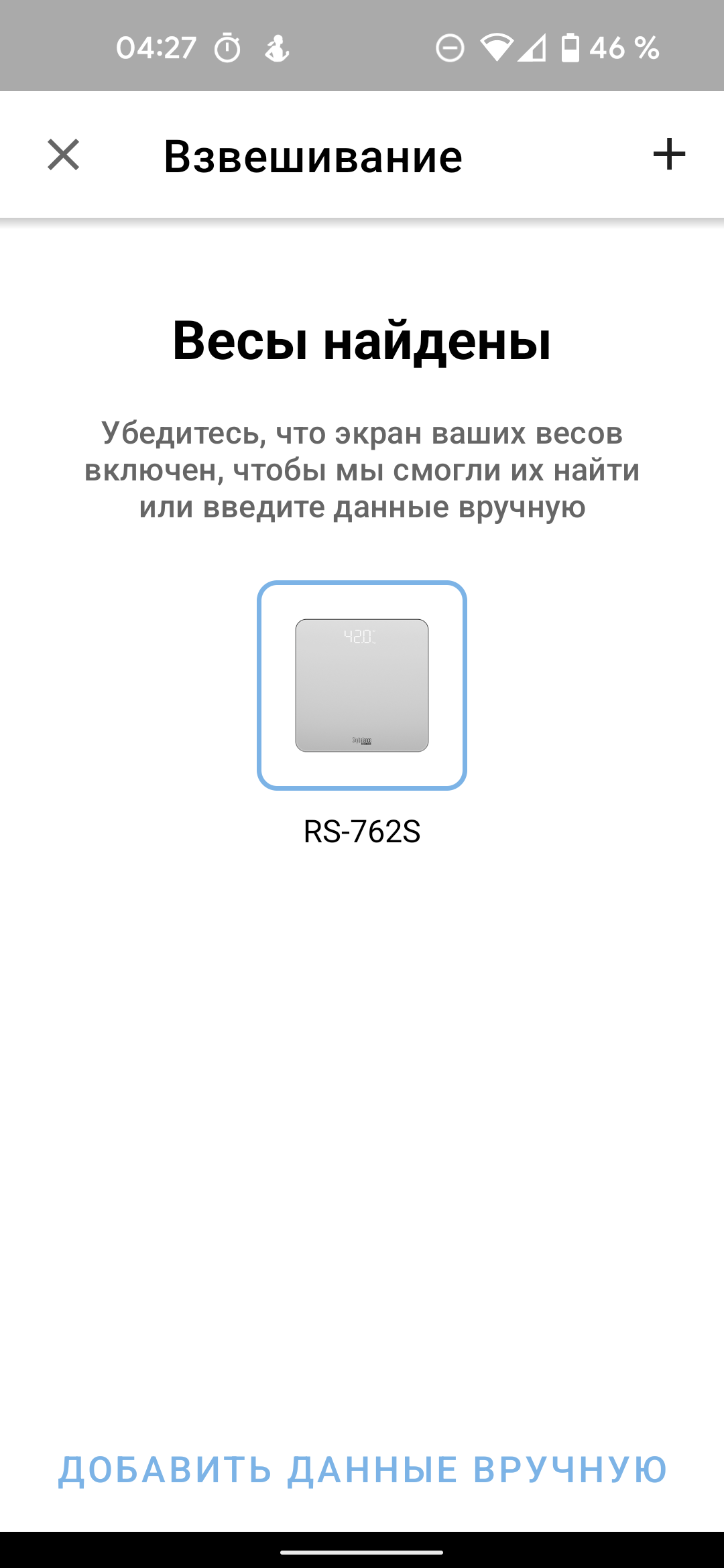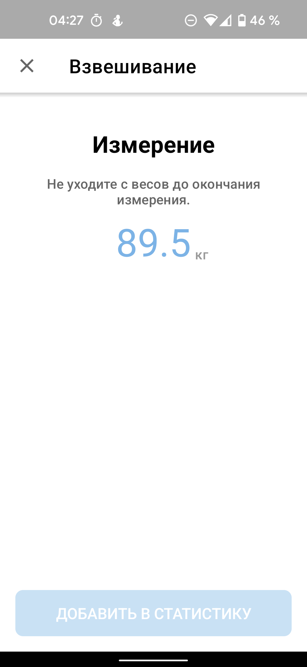 После нажатия на кнопку «Взвеситься» следует вывести устройство из режима сна, слегка нажав на панель до появления нулевого значения на дисплее, встать на весы и дождаться стабилизации показаний. И только тогда становится активной кнопка «Добавить в статистику».