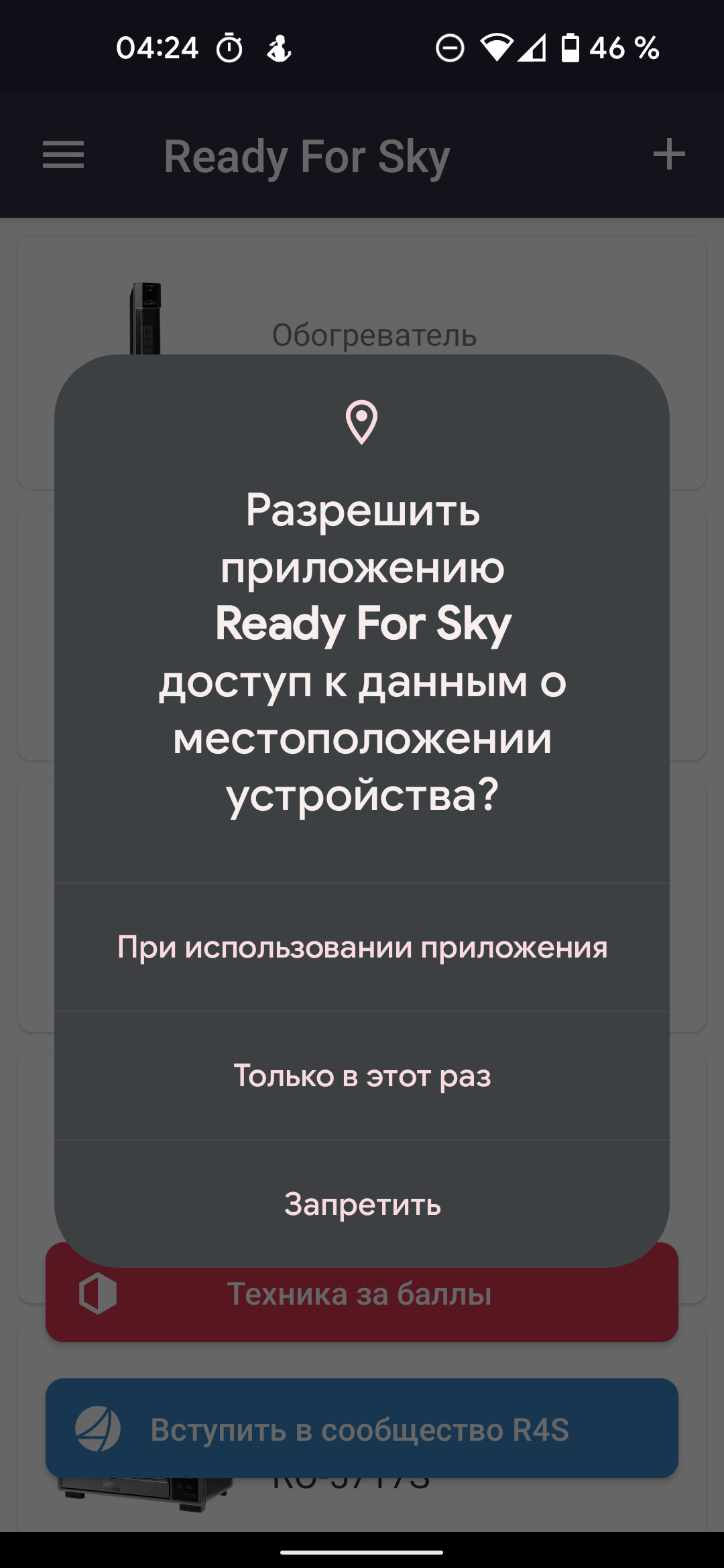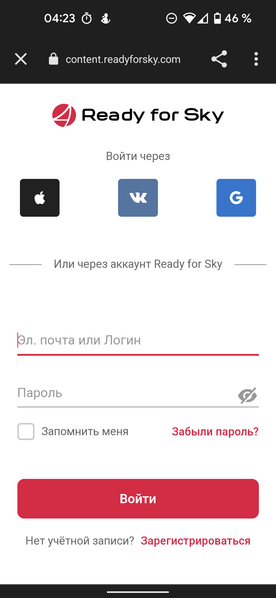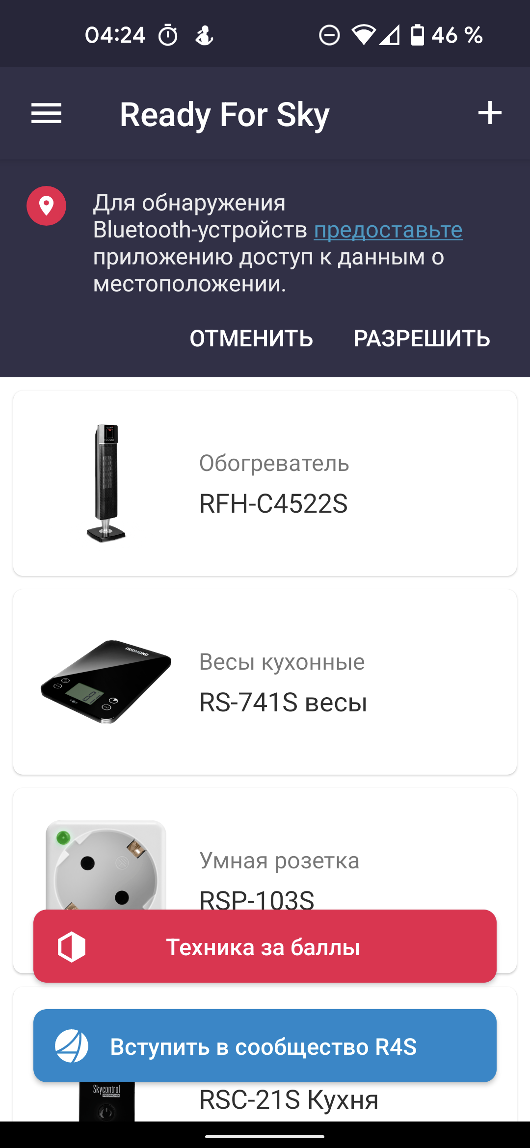 Для работы с устройством требуется регистрация. Приложение можно использовать с аккаунтом Ready for Sky или залогиниться в него с помощью AppleID, ВКонтакте, средствами Facebook или Google. Для успешного обнаружения весов потребуется также предоставить доступ к данным о местоположении устройства.
