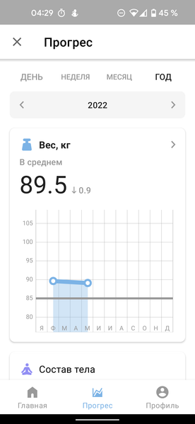 В разделе «Прогрес» (еще раз укоризненно покачаем головой, глядя на одно «с» в этом слове) данные взвешиваний можно видеть в динамике — за день, неделю, месяц и год.