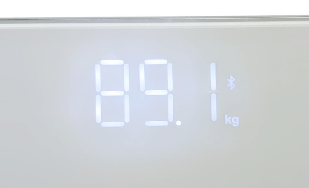 Самое главное на экране — вес. Кроме него здесь видны установленные единицы измерения (kg — килограммы, lb — фунты) и индикатор состояния интерфейса Bluetooth, который активен при подключении к смартфону.
