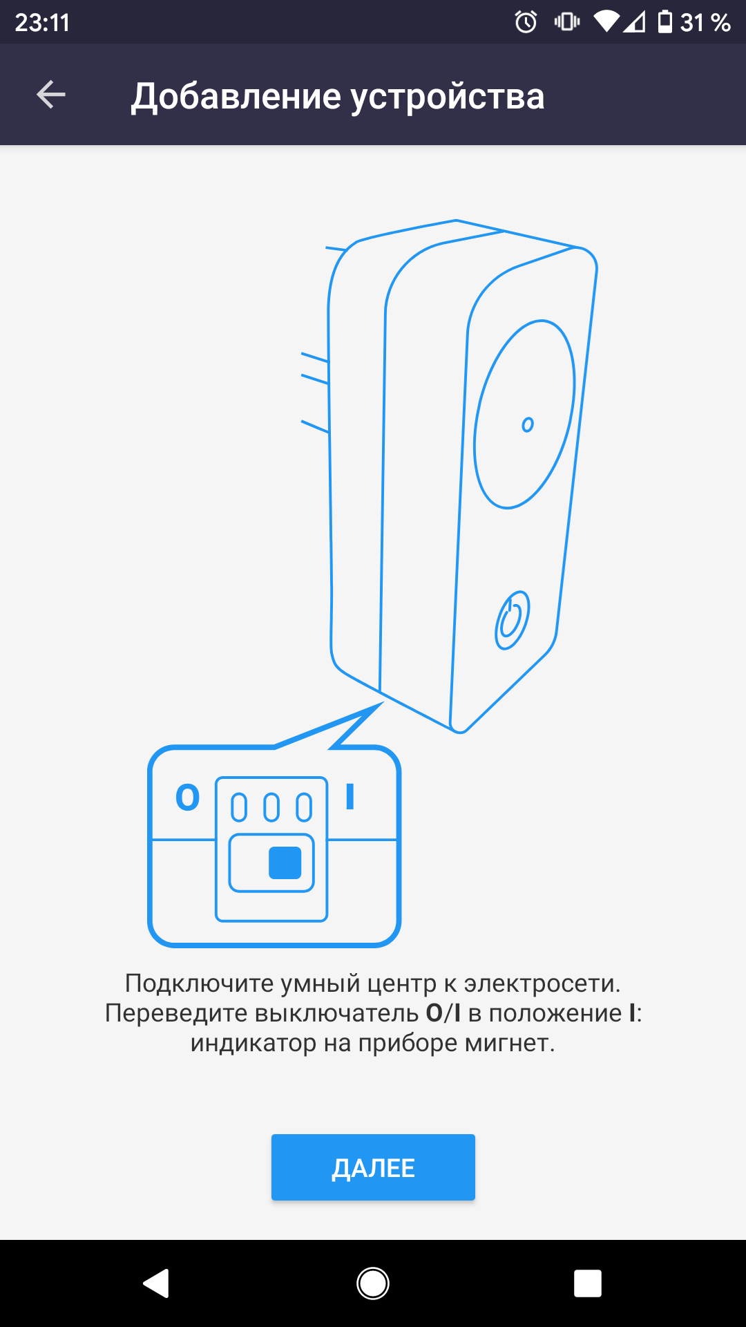 Приложение предложит выбрать собственный внутренний источник Wi-Fi с простым паролем и затем подсоединить умный центр к сети и включить его. Теперь устройство видно в приложении и его надо выбрать.