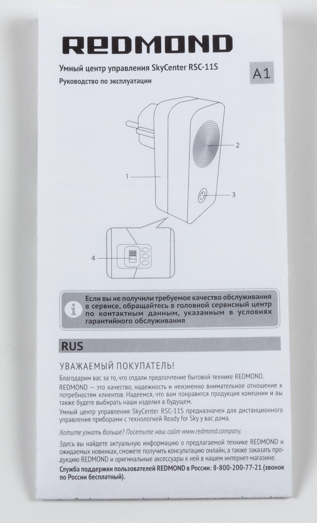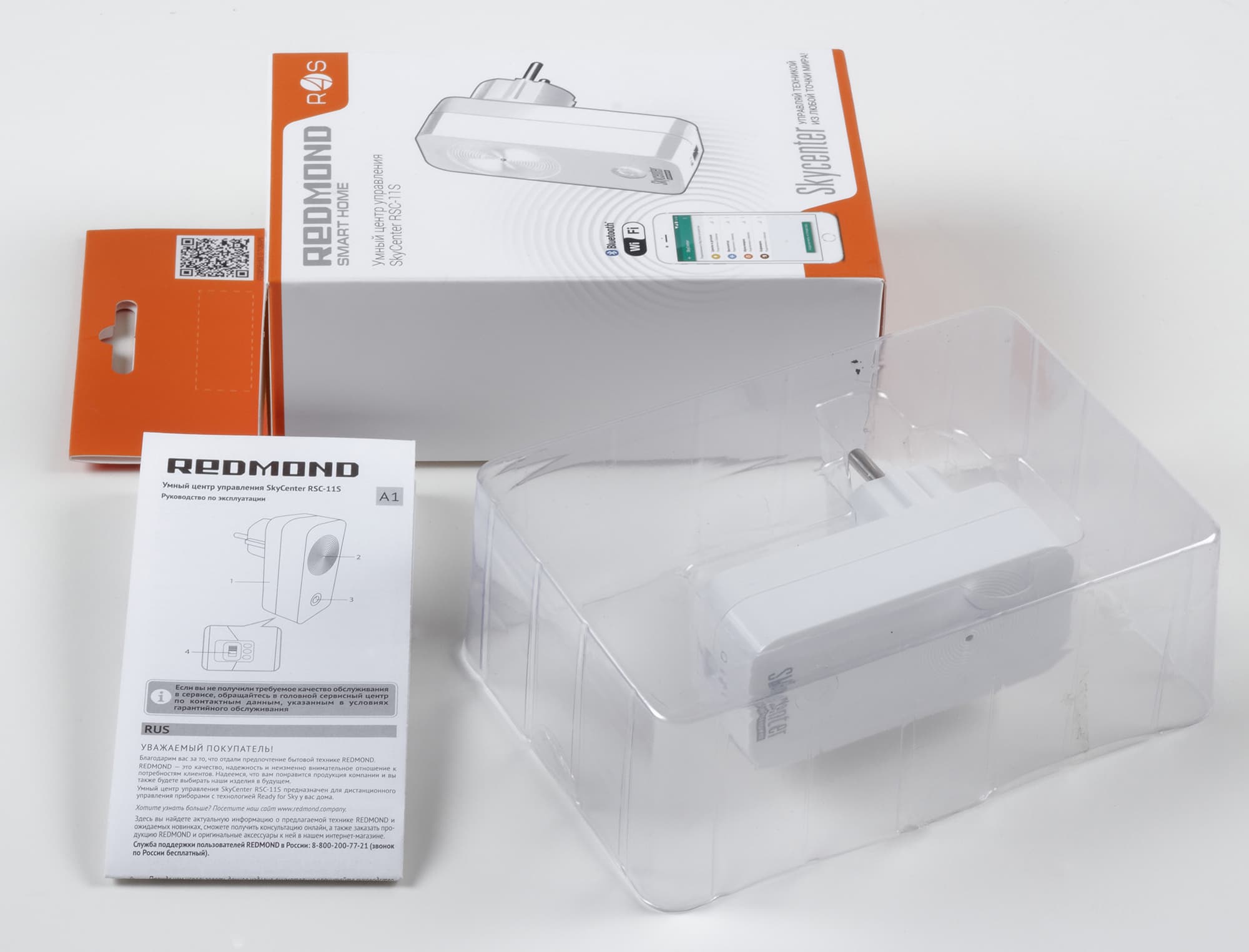Вскрыв коробку, внутри мы обнаружили бокс из прозрачного пластика, в который для безопасности перевозки был помещен SkyCenter RSC-11S, и инструкцию по применению.