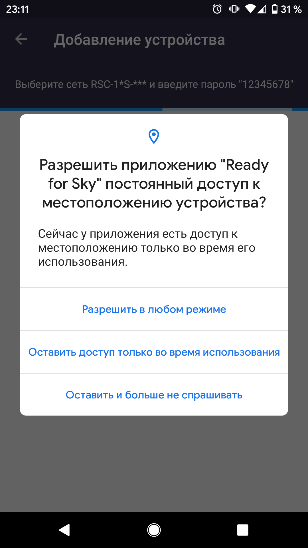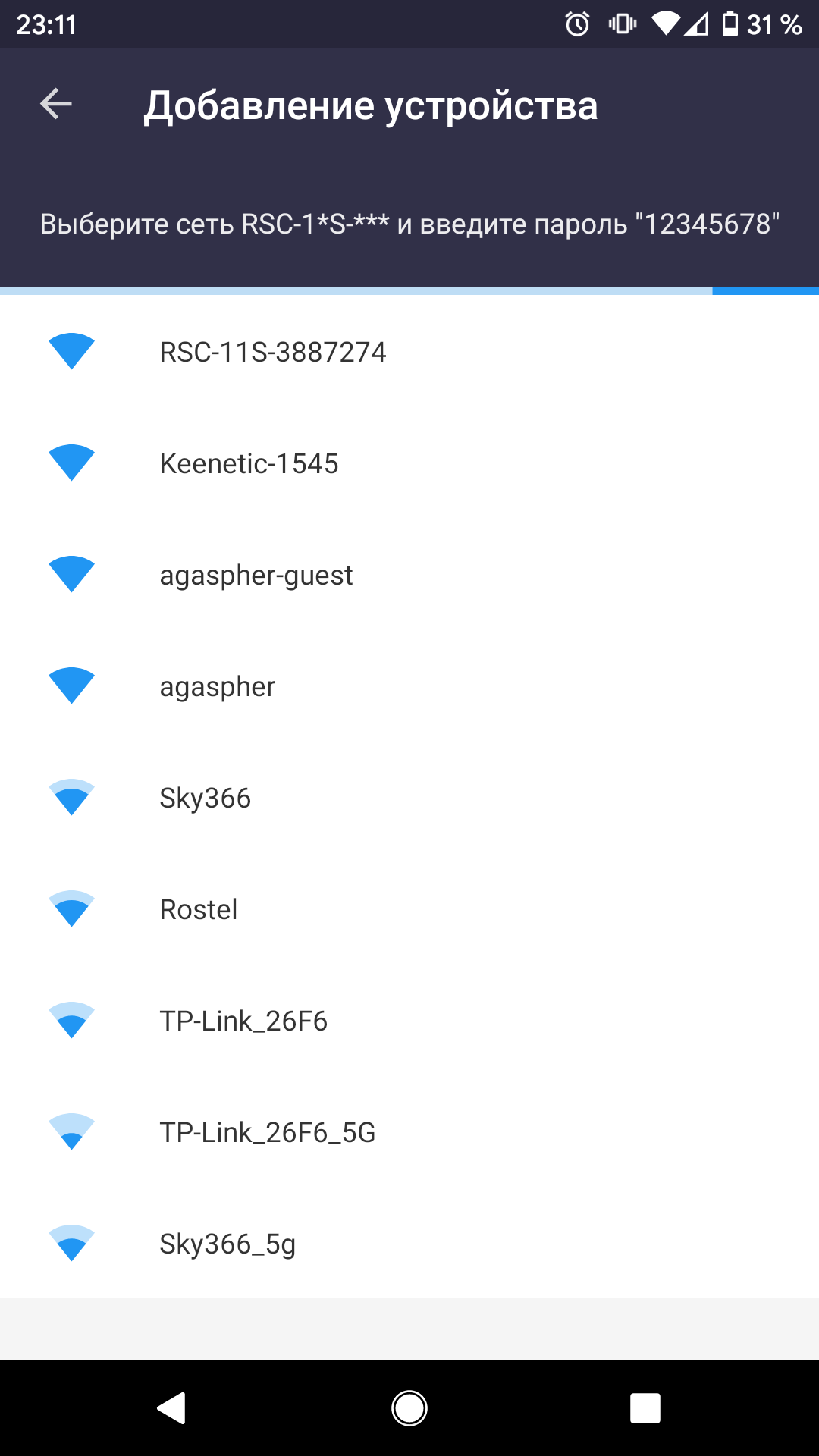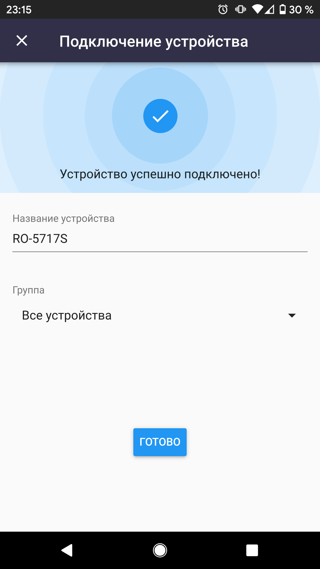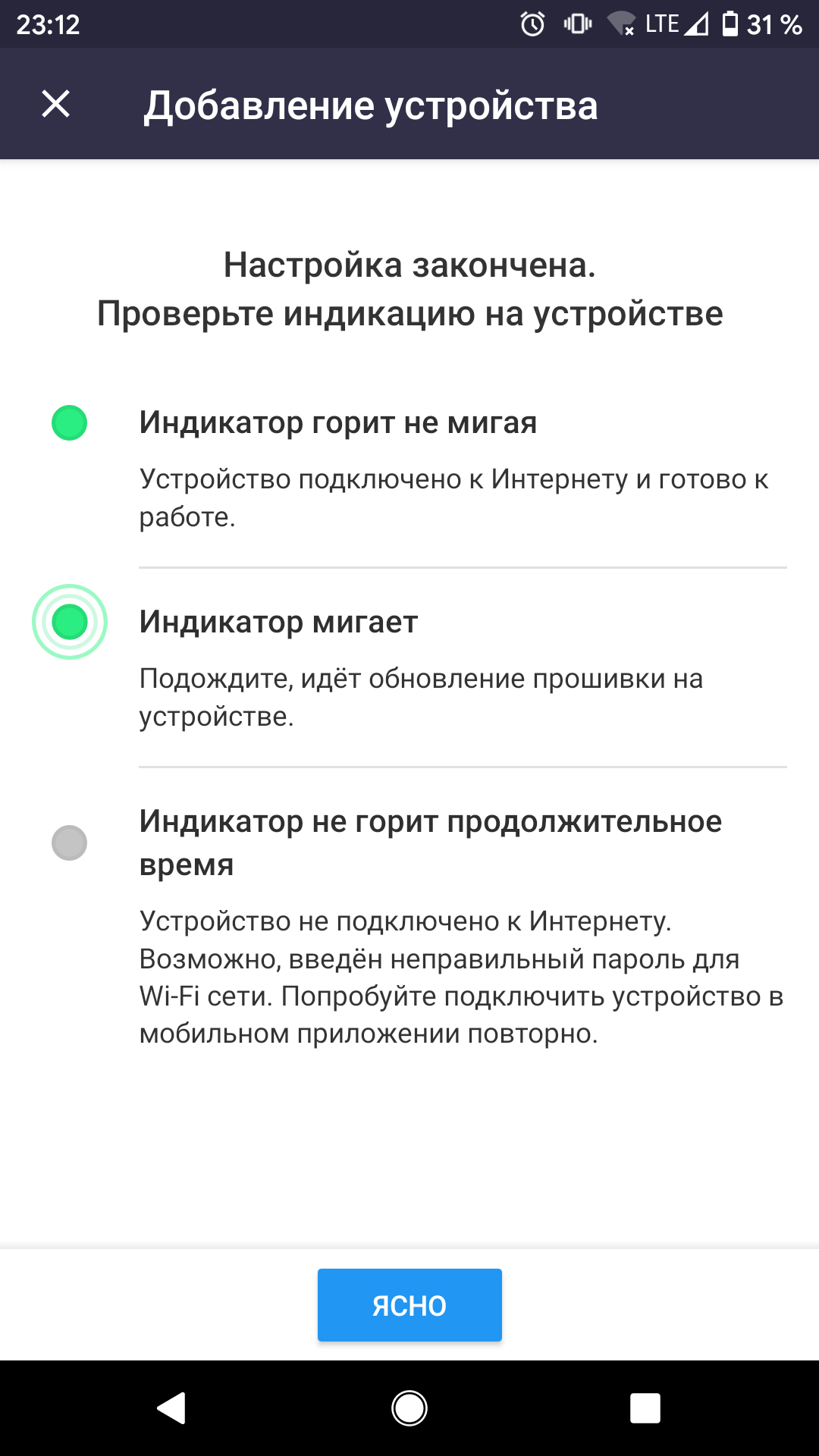 Когда мы нажали на строку устройства, нам предложили подключиться к уже нашему источнику Wi-Fi. Затем приложение в очередной раз, уже снаружи, нашло RSC-11S. Если тапнуть на эту строку, то после некоторого ожидания приложение сообщит, что успешно подключилось к устройству и оповестит об окончании настройки. Для того, чтобы окончательно завершить процесс, приложение просит проверить состояние индикатора на приборе: горит, мигает или не горит. Конкретно в момент демонстрации этого экрана индикатор не горит, но если нажать кнопку «Ясно», то он загорится.