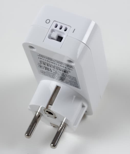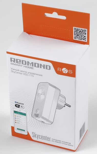 Redmond SkyCenter RSC-11S сделан из белого гладкого пластика. Это параллелепипед со скругленными углами, на передней стороне которого есть выступ — вилка для обычной электрической розетки, а с задней белая кнопка управления и светодиод в симпатичном узоре из концентрических кругов.