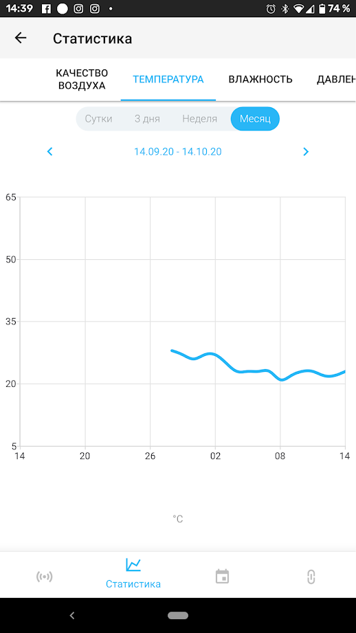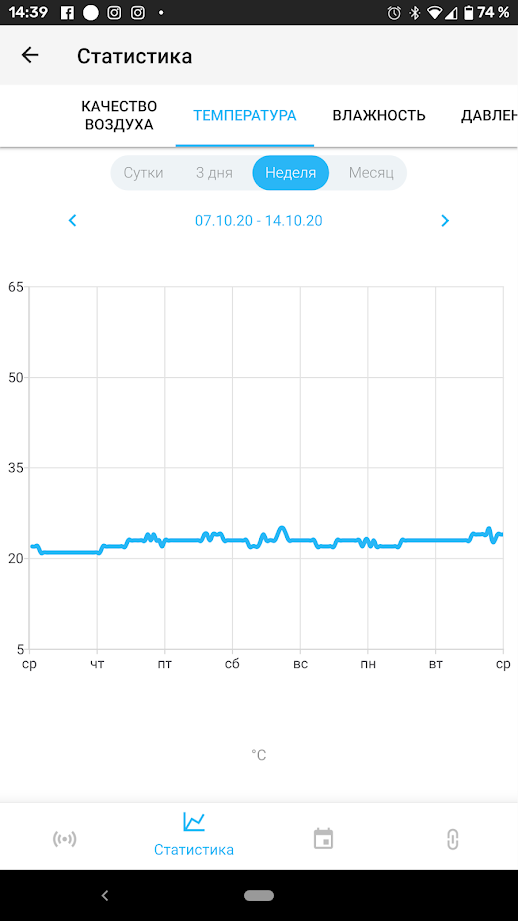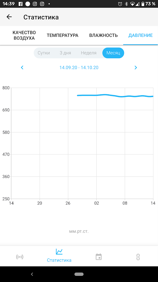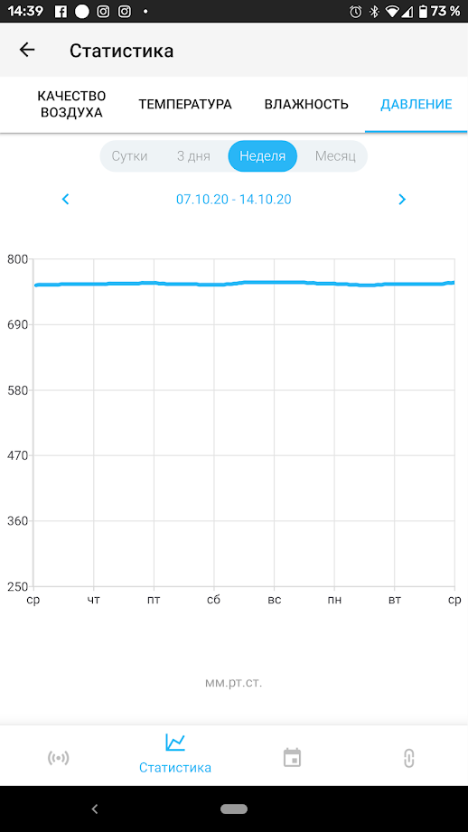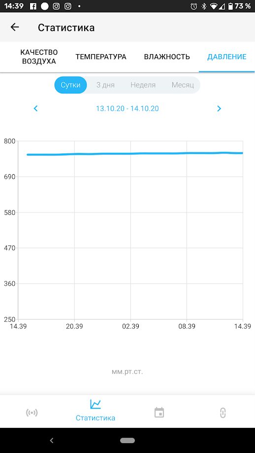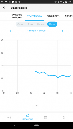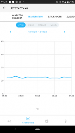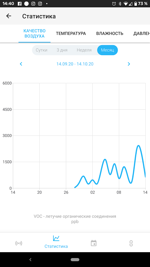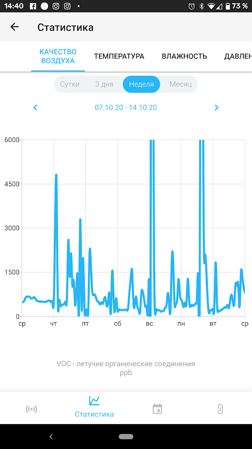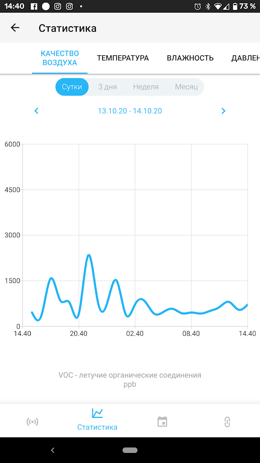 Страница статистики позволяет посмотреть историю изменений контролируемых станцией параметров за последние сутки, три дня, неделю и месяц. На скриншотах можно видеть, как меняется качество воздуха, измеряемое прибором.