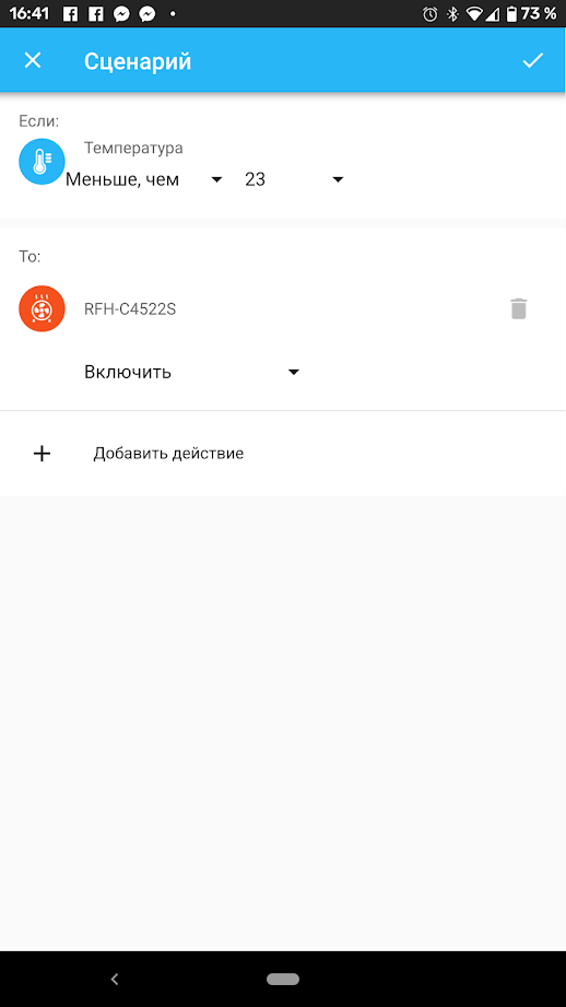 После сопряжения устройство становится доступным в сценарии. К сожалению, несмотря на то, что SkyHeat C4522S имеет два уровня мощности нагревателя, а также может работать как вентилятор, приложение предоставляет только две «кнопки» управления прибором: при достижении заданной температуры или влажности его можно либо включить, либо выключить.
