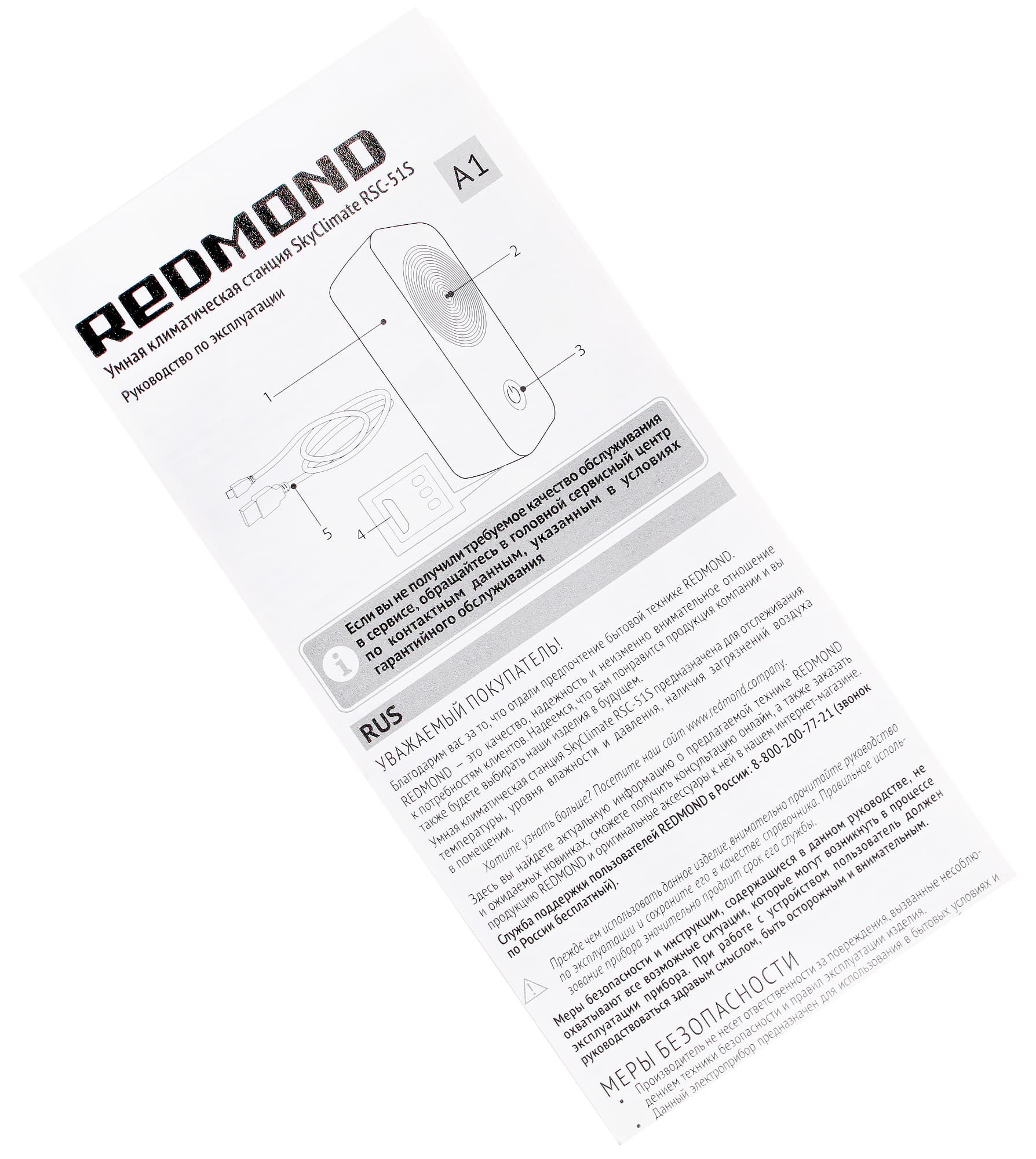 Руководство по эксплуатации Redmond SkyClimate RSC-51S — это лист плотной бумаги размером в полтора формата А4, сложенный гармошкой. Документ составлен на четырех языках (русском, украинском, казахском и английском). Шрифт довольно мелкий, но качество печати делает его вполне читаемым. Однако для людей со слабым зрением удобнее будет воспользоваться электронной версией на сайте производителя.