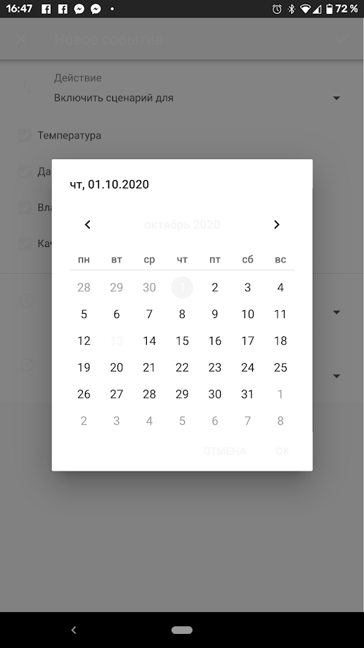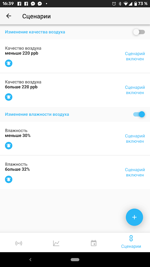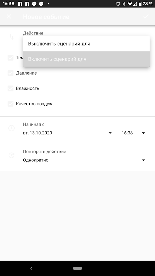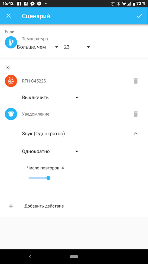 При желании для сценария можно настроить звуковое оповещение: тогда одновременно с запуском настроенного прибора климатическая станция будет издавать один или несколько сигналов. Их количество и продолжительность также настраивается в приложении.