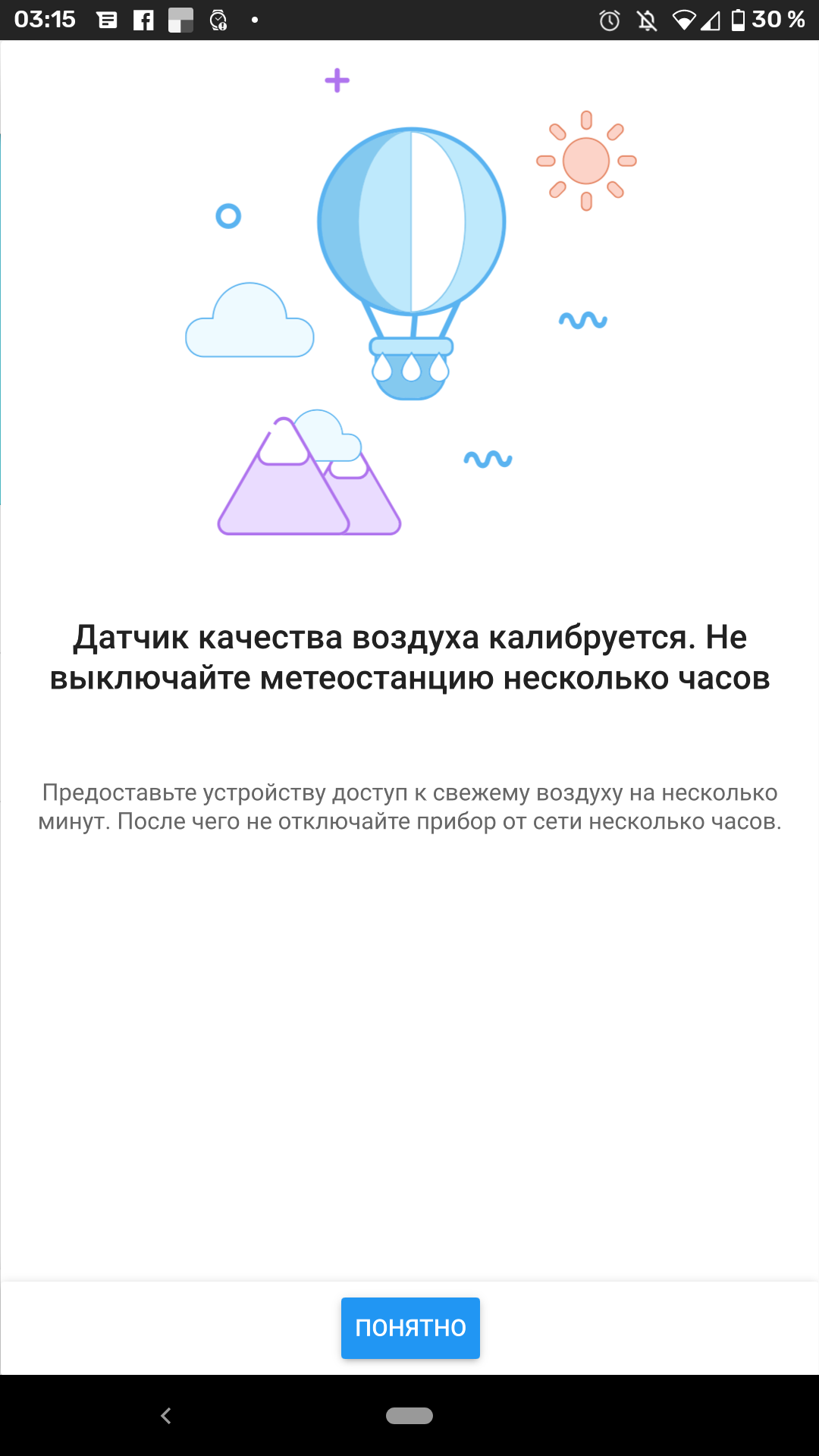 Метеостанция появилась в списке подключенных приборов. Приложение предупредило о том, что для калибровки датчика качества воздуха потребуется несколько часов, и мы попали на главный экран. На нем отображаются текущая температура воздуха и три шкалы: атмосферного давления, качества воздуха и относительной влажности.