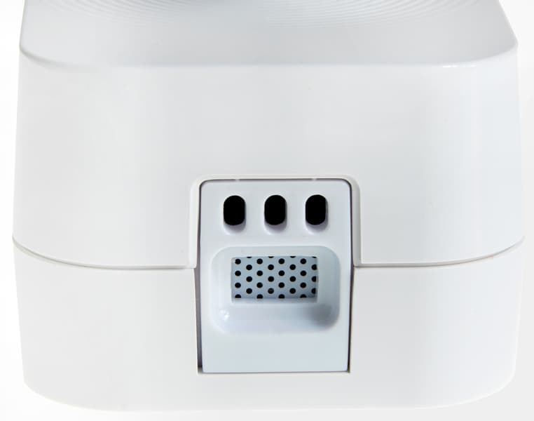 В торце корпуса, помимо трех вентиляционных отверстий, есть окошко, закрытое пластиковой решеткой. За ним располагаются датчики.