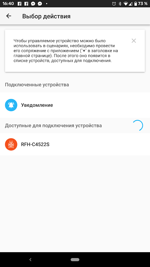 Кнопкой «добавить сценарий» мы создаем новый скрипт с этими условиями. В нижней части экрана можно видеть, что станция видит наш нагреватель и считает его доступным для подключения. При нажатии на иконку устройства приложение предлагает произвести сопряжение станции и климатического прибора, демонстрируя подсказку на экране.