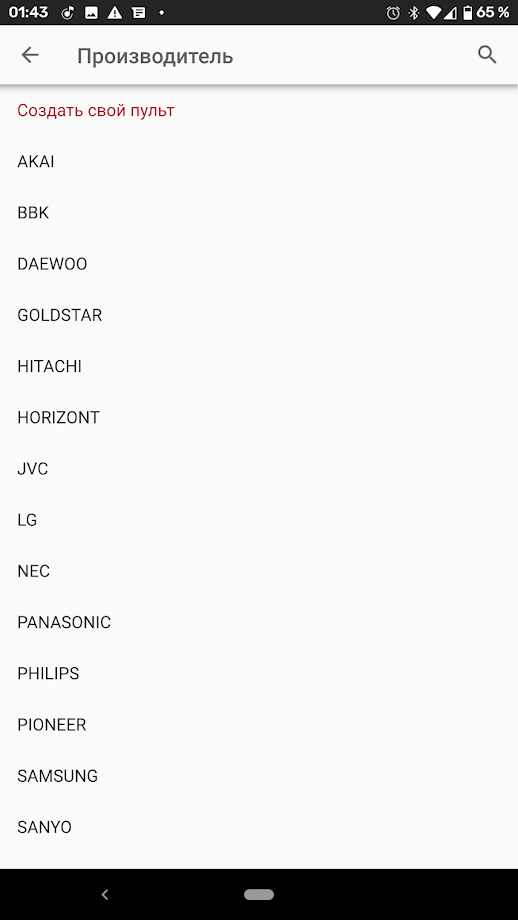 Нажав на кнопку «добавить пульт», мы попадаем в меню выбора категорий устройств. На этом этапе нас ожидало разочарование. Из тринадцати категорий устройств, среди которых значатся DVD-плееры, аудиосистемы, системы спутникового телевидения и многое другое, список предустановленных в приложении производителей техники имелся только в категории «телевизоры». Приложению известно всего тринадцать изготовителей телевизоров, и большая часть их списка помещается на одном экране.