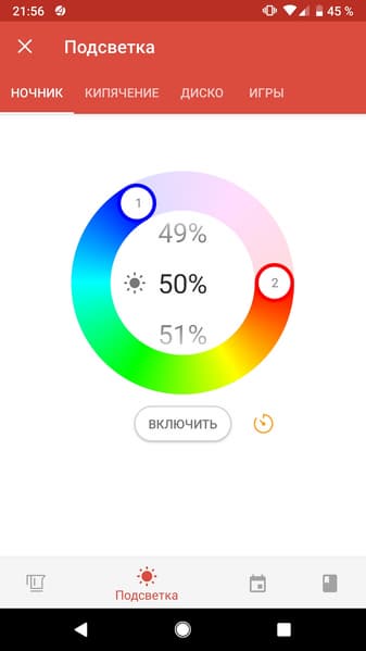 «Диско» — это режим, при котором подсветка «слушает» музыку и в такт ей меняет цвета. Можно включить музыку на том же устройстве, которое управляет чайником, а можно на любом другом. Главное — не выводить управляющий смартфон из режима «Диско», а то подсветка выключится.
