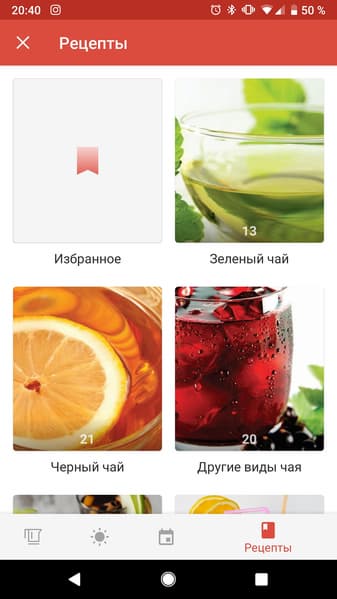 Ну и наконец, последний раздел: книга рецептов. Тут приведены рецепты не только заваривания разных видов чая, но и приготовления чайных напитков, детского питания, спортпита, соусов, каш и салатов, для которых нужна кипящая или горячая вода. В рецепте указана вода нужной температуры, и если кликнуть в рецепте на кнопку «Вкл.» в правом нижнем углу, то чайник немедленно начнет греться до нужной температуры. А дело пользователя — приготовить нужные ингредиенты.