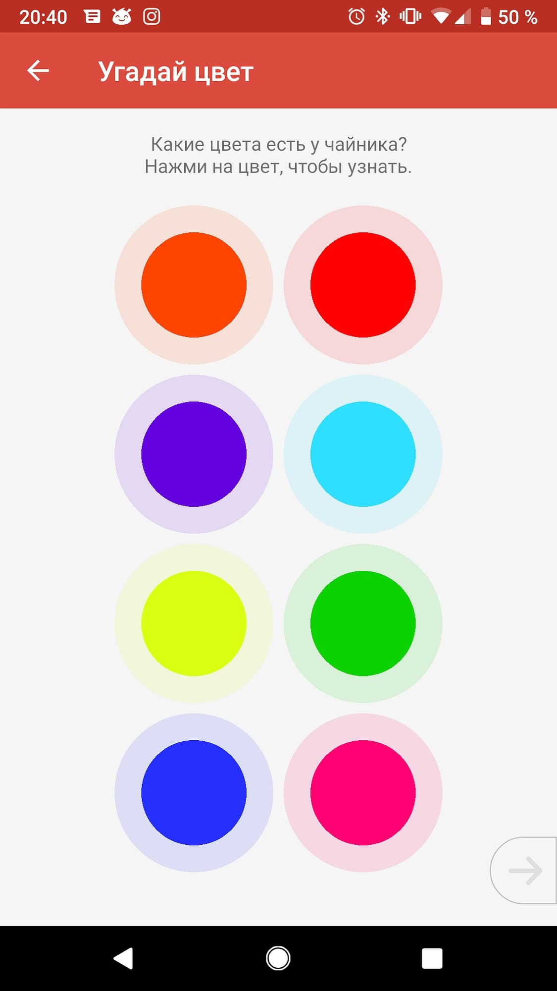 В «Играх» есть три игры, которыми можно занять ребенка, если взрослые готовят обед, а деточке непременно надо поучаствовать. Главное — не давать подобраться поближе к чайнику из соображений безопасности. Игры простенькие: для тренировки памяти нужно запомнить комбинацию цветов, которые покажет чайник и нажать на нужные кружочки, для тренировки внимания — нажимать на тот цвет, который покажет чайник. «Угадай цвет» — отличная была бы развивалка для самых маленьких, и педагогический момент есть: задан вопрос «А что еще такого цвета?»… Вот только цвета на экране смартфона и в подсветке чайника не всегда совмещаются. Особенно часто путаются желтый с зеленым и фиолетовый с малиновым.