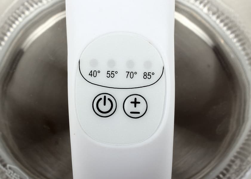 Если просто нажать кнопку питания, то чайник вскипятит воду, автоматически отключится и начнет медленно остывать. Если же с помощью кнопки «плюс-минус» задать одну из пяти предустановленных температур, то, в зависимости от текущей температуры воды, чайник либо нагреет ее до выбранной температуры, либо подождет остывания воды до той же нужной температуры, а потом в любом случае будет ее поддерживать в течение 12 часов.