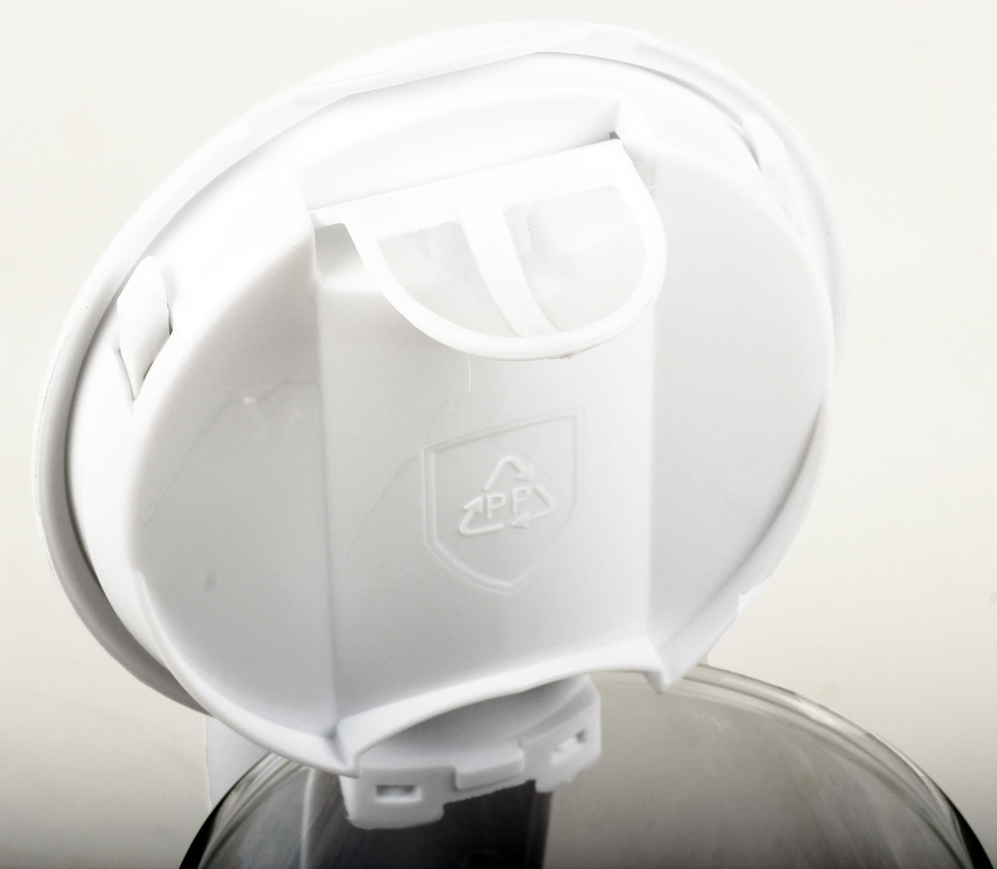 Крышка чайника откидывается с помощью расположенной на ней широкой и удобной защелки. При этом открывается она практически бесшумно, а закрывается с легким щелчком. Соединение с корпусом у крышки надежное, защелкивается она плотно, а в открытом виде достаточно твердо держится практически под прямым углом к корпусу — этого достаточно для того, чтобы удобно было наполнять чайник водой из-под крана или из фильтра.