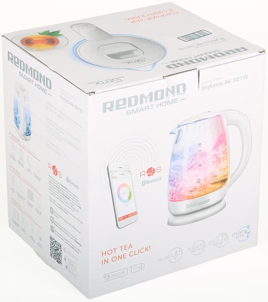 Коробка непривычного для Redmond белого цвета из глянцевого картона. Со всех сторон на ней написано название компании и модели и нарисован чайник в разных ракурсах. На верхней грани нарисованы чайник и чашка чая, вид сверху, и написан слоган «Горячий чай в один клик». На двух боковых гранях — чайник в профиль и изображение смартфона, от которого к чайнику идут Bluetooth-волны. Тут же написано, какое приложение надо ставить, чтобы управлять чайником по телефону.