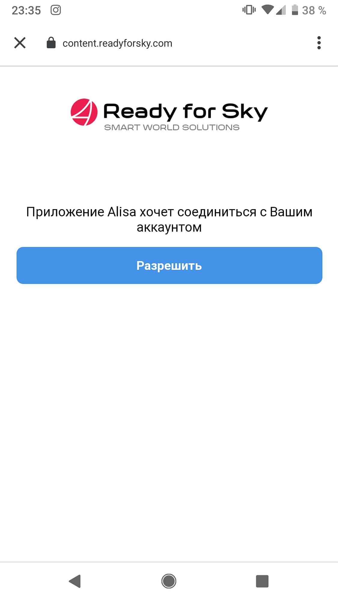 - В открывшейся форме ввести логин и пароль от учетной записи, как в приложении Ready for Sky, выполнить вход, дать согласие на передачу управления умными устройствами Алисе