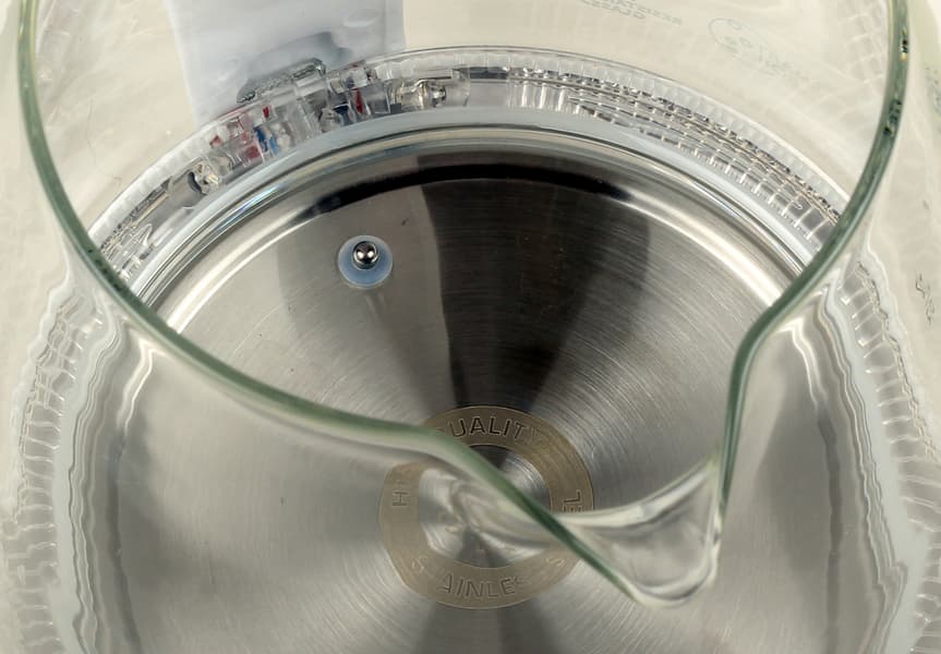 Дно чайника — из нержавеющей стали, гладкое, с датчиком аварийного отключения, отключающим нагревательный элемент при полном выкипании воды в случае отказа датчика закипания (или при включении без воды).