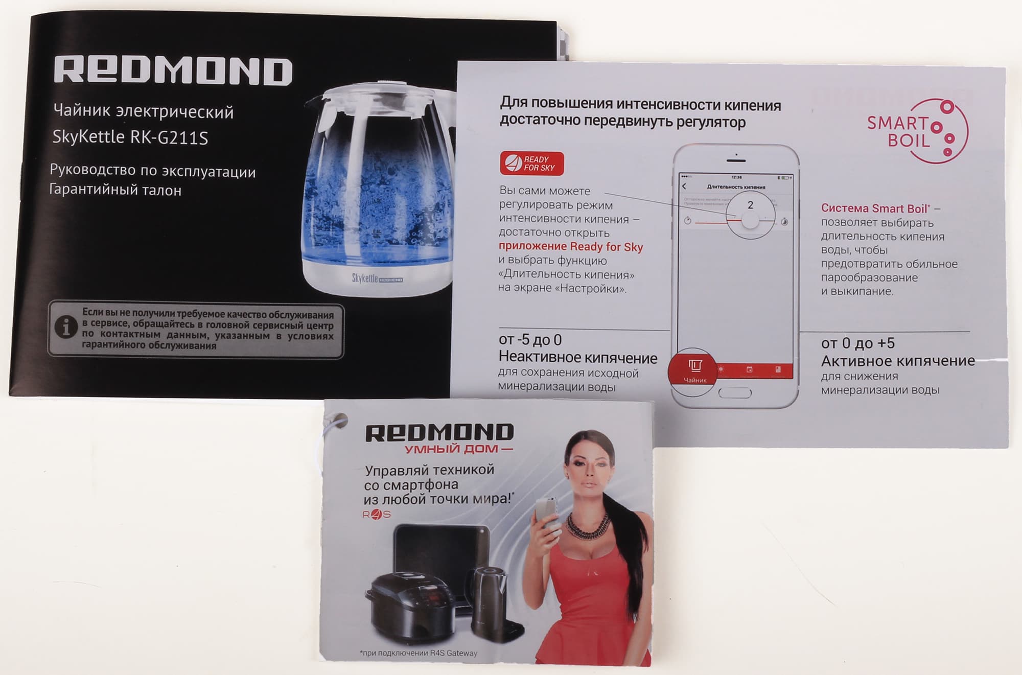 Руководство по эксплуатации электрического чайника SkyKettle RK-G211S — это маленькая книжечка в черной глянцевой обложке, где совмещены собственно инструкция и гарантийный талон. Так что, как бы ни было удобно пользоваться PDF-инструкцией на сайте Redmond, бумажную ее версию все равно выкидывать не стоит.