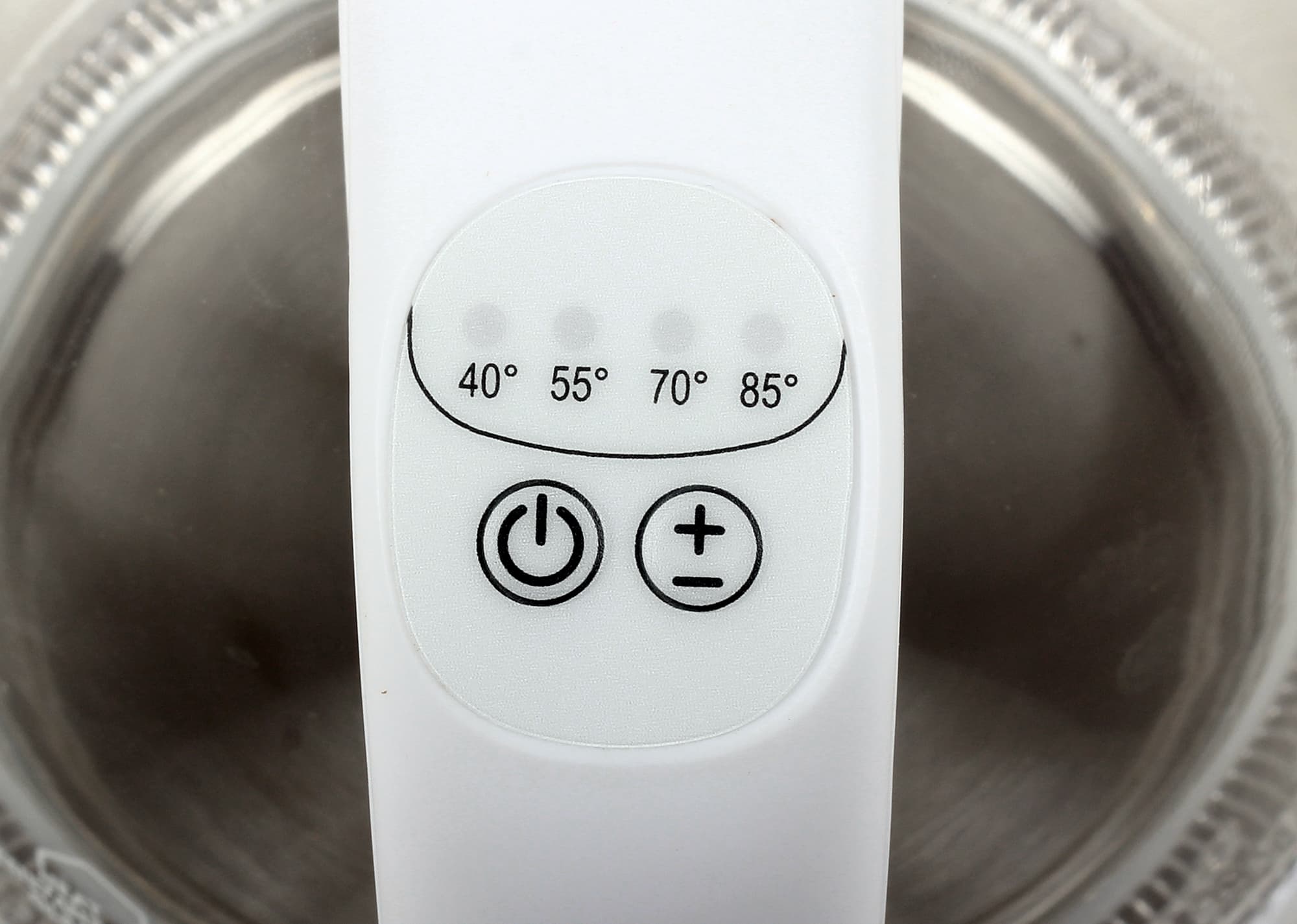 Наверху в том месте, где ручка переходит в корпус, расположена панель управления чайником. Она включает пять светодиодов, каждый из которых предназначен для индикации одного из базовых (задаваемых с чайника) температурных режимов, и две маленьких кнопки: питания (для включения и выключения) и «плюс-минус» — с ее помощью задается температура нагрева.