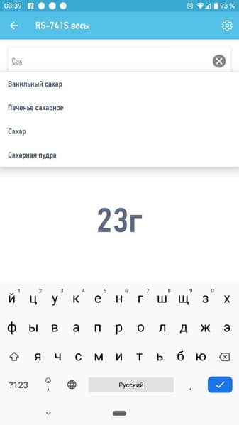 Помещаем взвешиваемый продукт на весы, видим вес продукта на дисплее весов и на экране приложения. В текстовом поле приложения начинаем набирать название продукта и выбираем нужную нам позицию из появившегося выпадающего списка.
