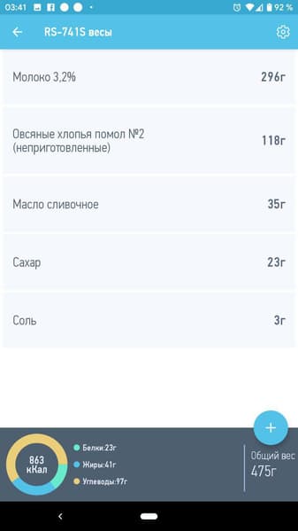 Приложение показывает вес каждого взвешенного продукта, а в панели под списком ингредиентов — общую энергетическую ценность нашего блюда (в данном случае — каши из овсяных хлопьев), общий вес и информацию о содержании белков, жиров и углеводов.