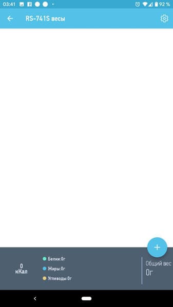 После того, как весы синхронизировались со смартфоном, мы выбираем их в списке доступных в Ready for Sky устройств и попадаем в список взвешиваемых продуктов. Изначально он пуст.