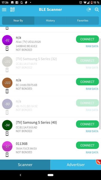 В длинном списке доступных устройств мы находим наши весы (на скриншоте они видны как 01136B) и нажимаем на Connect.