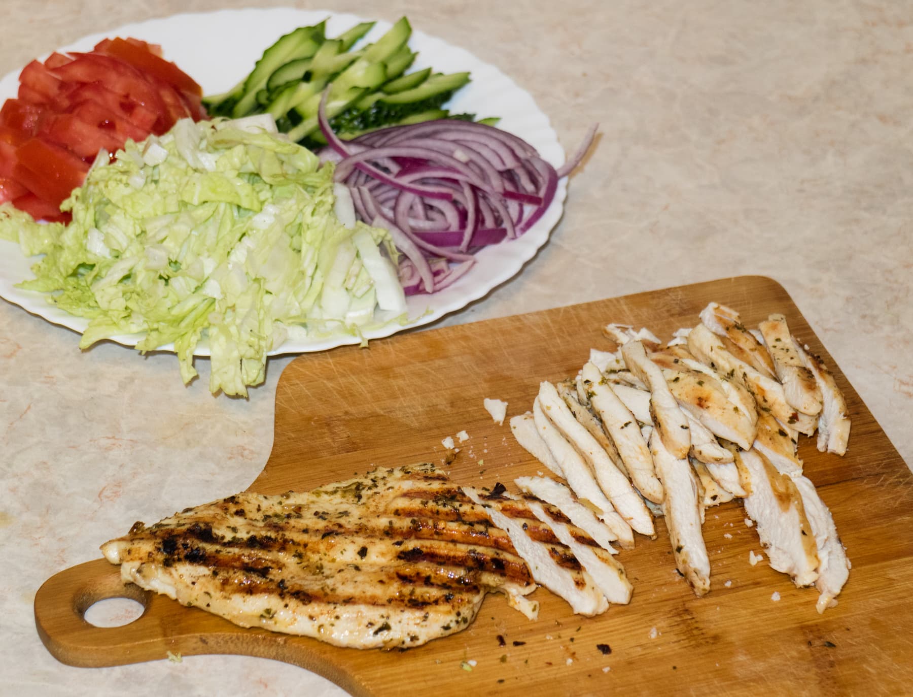 Нарезали на длинные узкие брусочки свежие овощи: помидоры, репчатый лук, пекинскую капусту, огурцы и приготовленное в предыдущем тесте филе куриной грудки. Приготовили соус на основе сметаны, добавив в нее давленый чеснок, соль и мексиканскую смесь специй (кориандр, зира, перец чили и ряд других специй и зелени). Нарезали армянский лаваш на подходящие куски и наполнили их начинкой и соусом. Аккуратно сложили шаверму.