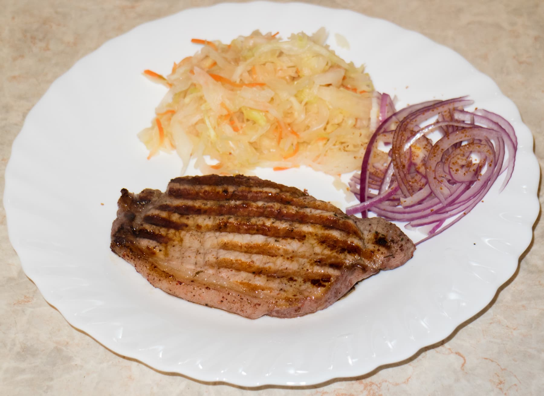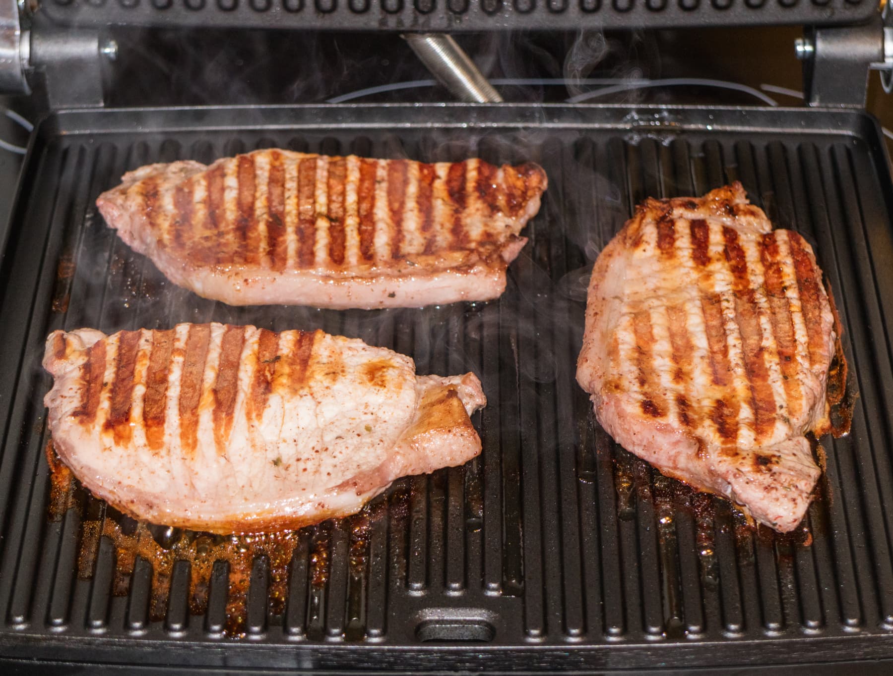 Карбонат был разделан на порционные куски толщиной около полутора сантиметров и замаринован в смеси красного вина, аджики и соли. Мариновалась свинина около суток. Перед обработкой в гриле обсушили ломтики мяса с помощью бумажного полотенца. Жарили в режиме максимального нагрева жарочных поверхностей. Во время данного теста мы оценили преимущества большой площади жарочных панелей: на них свободно размещались три больших куска мяса, при желании можно было бы уложить и четвертый кусок. Жарка занимала в зависимости от величины и толщины куска около 6-7 минут.