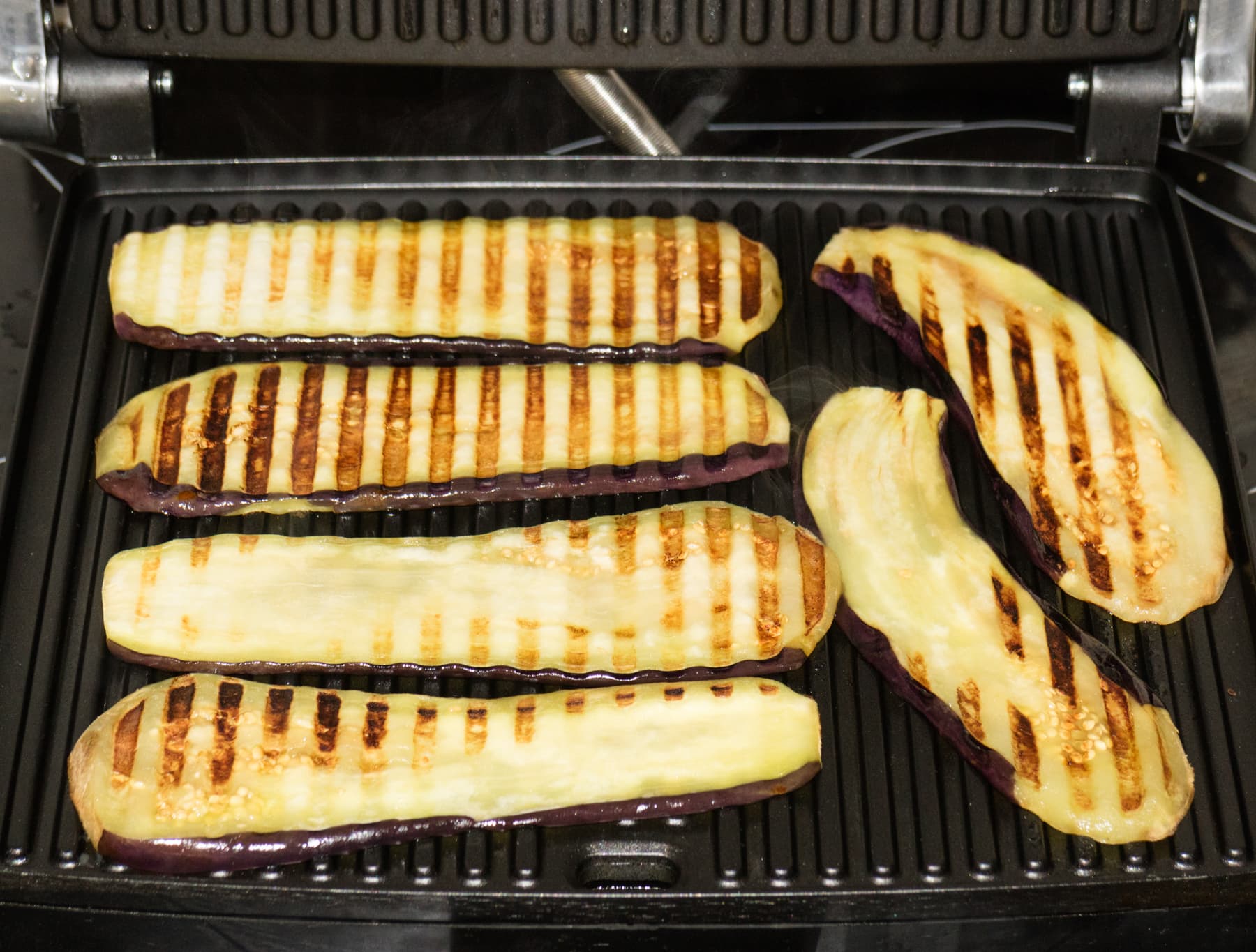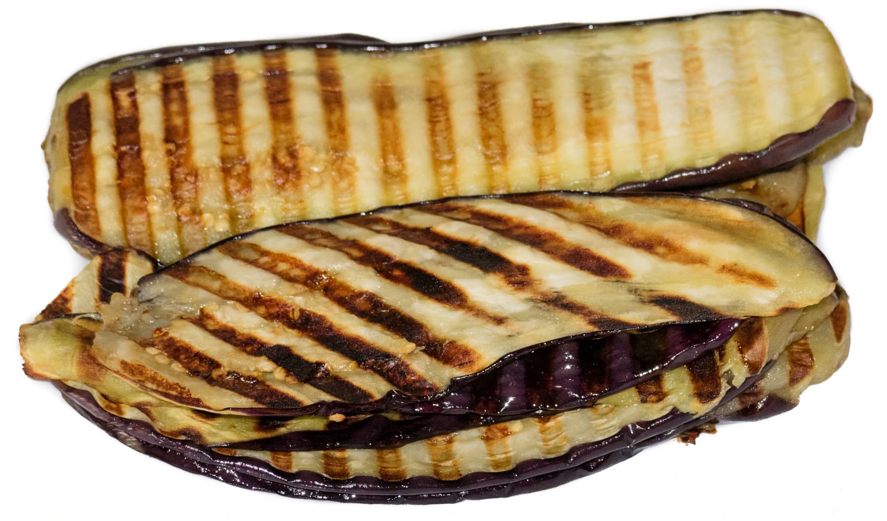 Баклажаны нарезали на ломтики толщиной около 0,5 см или чуть тоньше, посолили и оставили на некоторое время для выделения излишней влаги. Затем хорошо отжали кусочки, высушили их с помощью бумажных салфеток и смазали оливковым маслом.