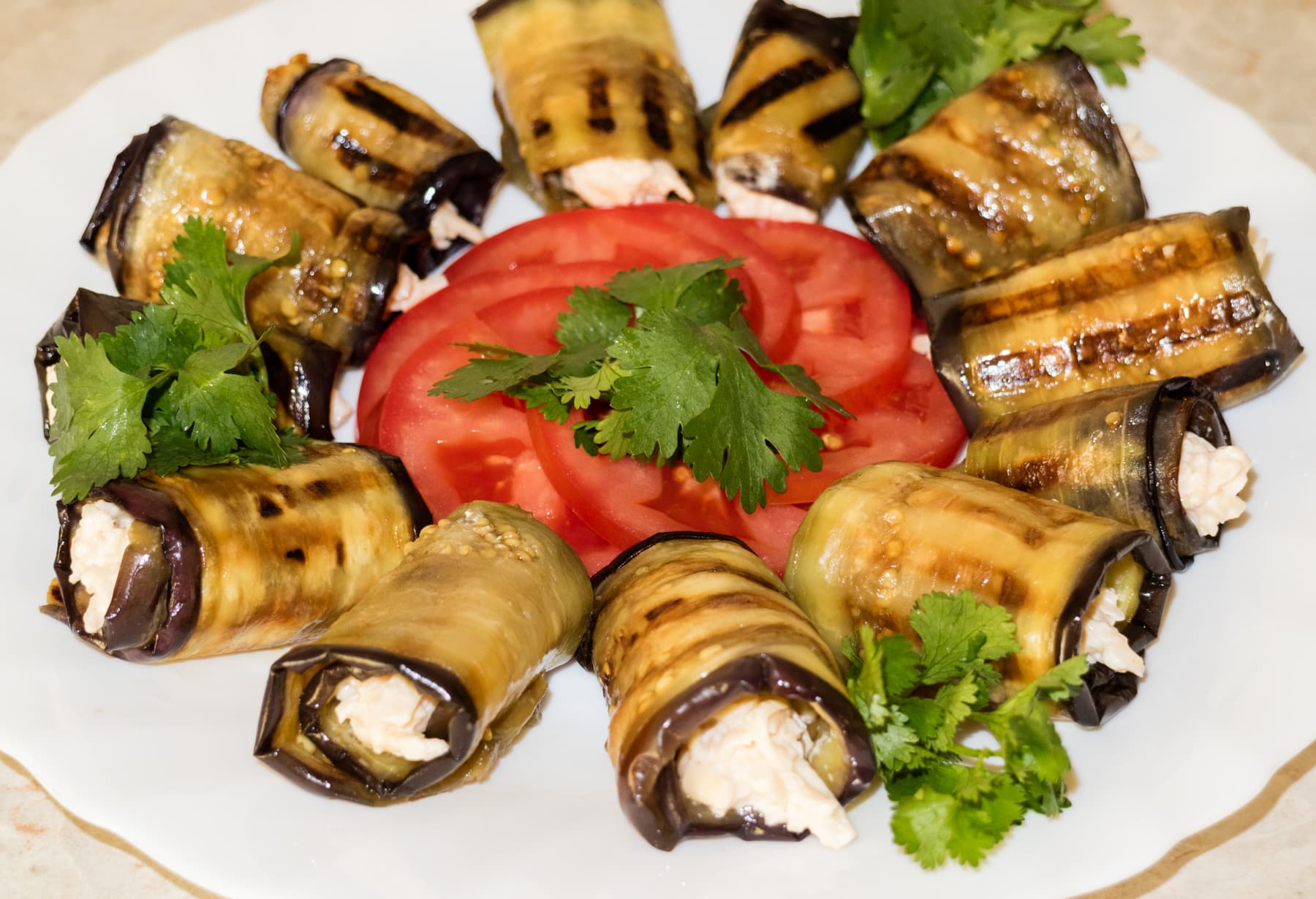 Приготовили начинку: натерли сыр, выдавили несколько зубчиков чеснока и немного майонеза. Хорошо перемешали и наполнили ломтики баклажанов начинкой, аккуратно свернув их в рулетики.