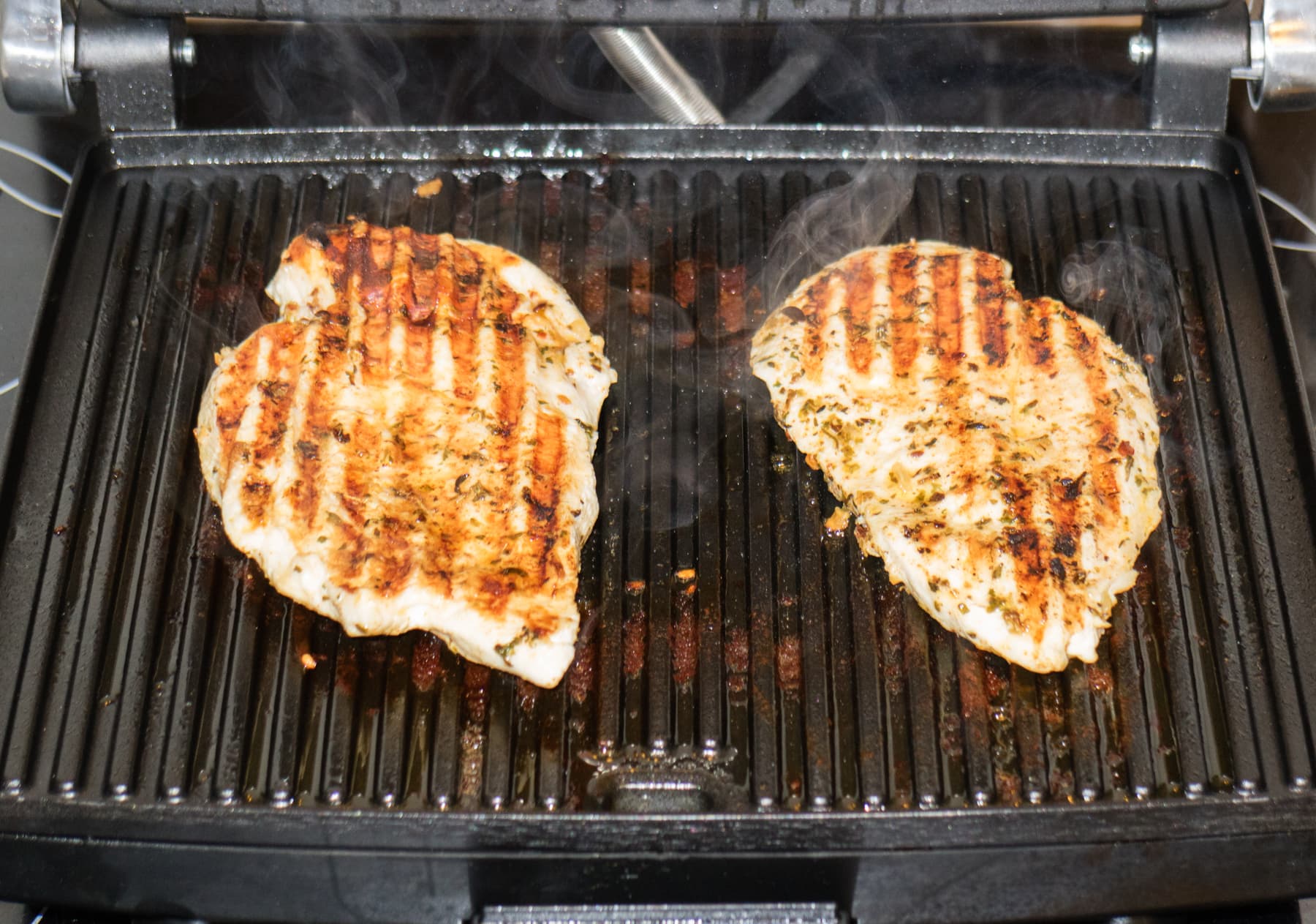 Несмотря на незамысловатость технологии приготовления, мы решили воспользоваться рецептом из книги, входящей в комплект. Следуя инструкции, мы смешали в отдельной емкости соль, оливковое масло и специи. Затем натерли полученной смесью разделанное на равномерные ломтики куриное филе. Дали птице постоять в маринаде около часа. Затем включили гриль и по достижении им рабочей температуры 4-го режима выложили на панели кусочки грудки. Перед размещением продукта внутри гриля хорошо промокнули излишки маринада бумажной салфеткой.