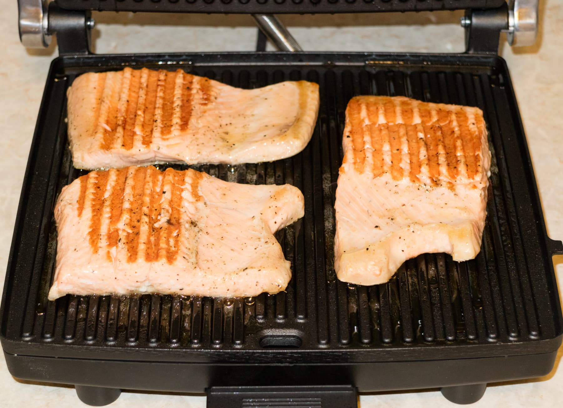 Очистили и разделали охлажденную форель, вырезав хребет и освободив филе ото всех костей. Нарезали филе на порционные куски. Каждый кусочек посолили, поперчили и сбрызнули оливковым маслом. Силиконовой кисточкой смазали панели растительным маслом. Жарили рыбу на 4-м температурном режиме в течение примерно 5 минут.