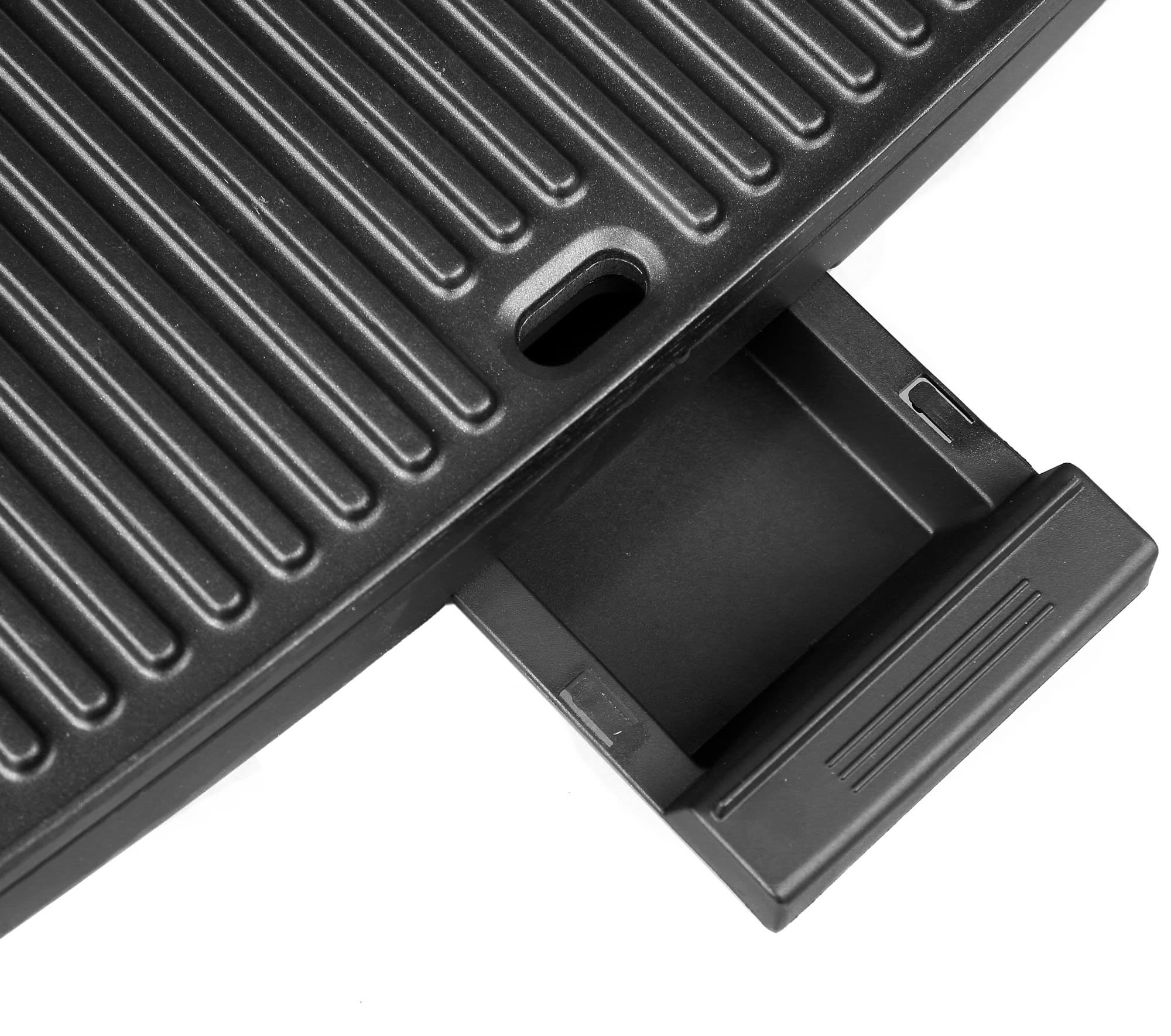 Объем поддона для сбора стекающей жидкости и жира достаточен. Жидкости стекали строго в него, не разбрызгиваясь и не вытекая за пределы жарочной поверхности. Поддон надежно зафиксирован внутри корпуса. Несмотря на то, что нижняя панель ориентирована строго горизонтально, без видимого наклона к наружной части, жидкость поступала в поддон, не скапливаясь, или же довольно быстро испарялась с жарочных панелей.