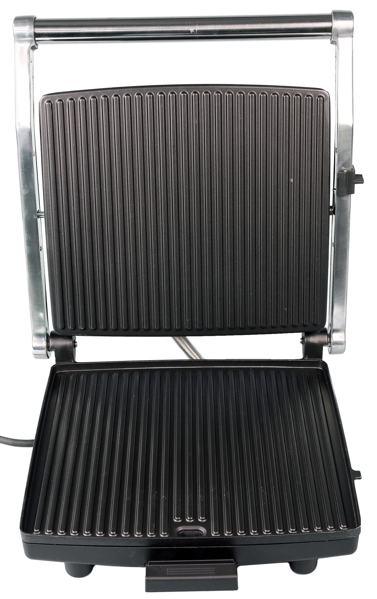 Жарочные панели являются несъемными. Поверхность панелей, контактирующая с продуктами, обработана антипригарным покрытием. Глубина нижней панели около одного сантиметра. В раскрытом виде гриль стоит устойчиво, не пытаясь опрокинуться назад.