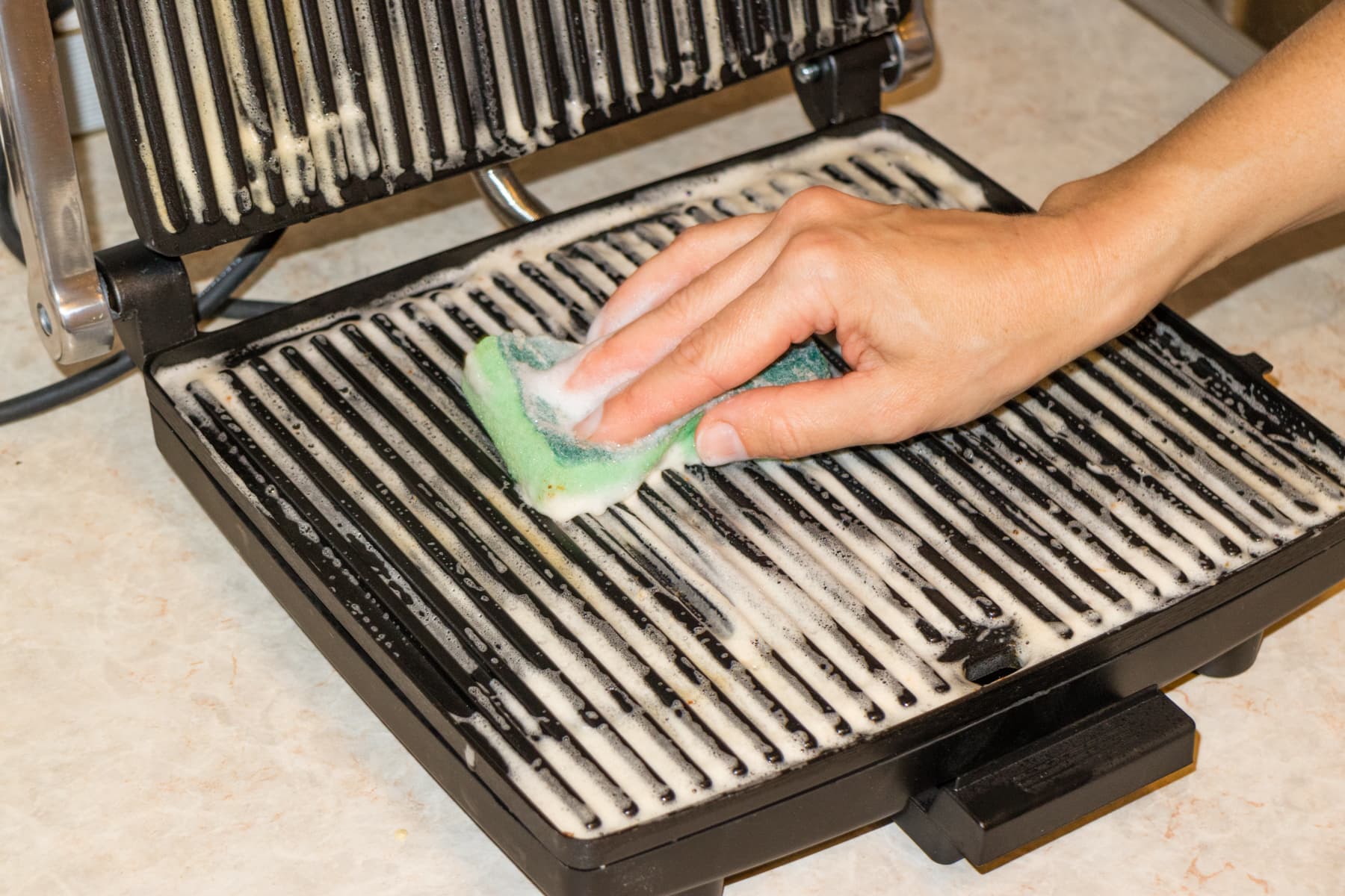 Единственный тест, в котором действительно хватило лишь протирания влажной тканью — это горячие бутерброды. Во всех остальных случаях мы поступали следующим образом: интенсивно смачивали верхнюю панель горячей водой при помощи губки. Стекая, вода увлажняла нижнюю панель. Сначала мы смывали наиболее крупные прилипшие кусочки продуктов или нагар. Затем второй, третий и последующие разы протирали панели губкой с моющим средством. Иногда использовали мягкую щетку для мытья посуды.