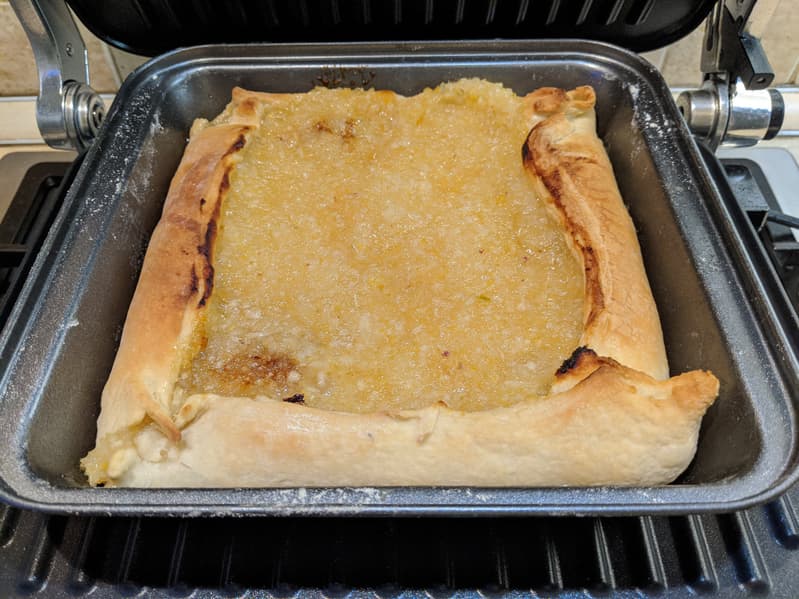 Ну и на сладкое мы решили протестировать функцию духовки. Вообще в кулинарной книге, приложенной к грилю, в глубоком противне готовят запеканки, а пироги пекут на гриле и только плоские, пресные и закрытые.