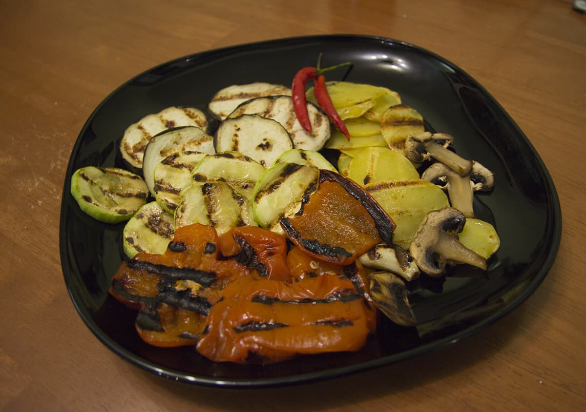 Кусок говядины (стриплойн) разрезали на два стейка и поместили их на разогретый в предустановленном режиме «Мясо» прибор. Первый кусок готовился до стадии rare, второй — well done. Овощи приготовили после мяса, пока стейк «отдыхал» под фольгой.