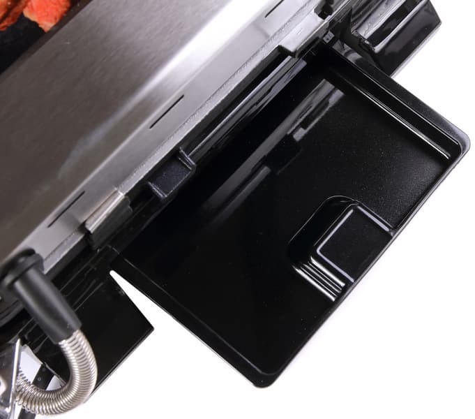 Поддон выдвигается сзади, что может быть не очень удобно, если гриль стоит у стены. Выдвигается легко, без перекосов, встает на место без усилий, но плотно.