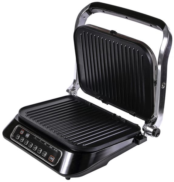 Панель управления расположена на лицевой части гриля. Его передняя стенка слегка скошена назад, чтобы дать пользователю удобный доступ к кнопкам. На панели есть кнопки «Вкл.» и «ОК» — наличие их обеих слегка напрягает, ведь отдельно вынесен ряд кнопок, которые позволяют готовить пищу в предустановленных режимах, зачем же тут еще и «ОК»?