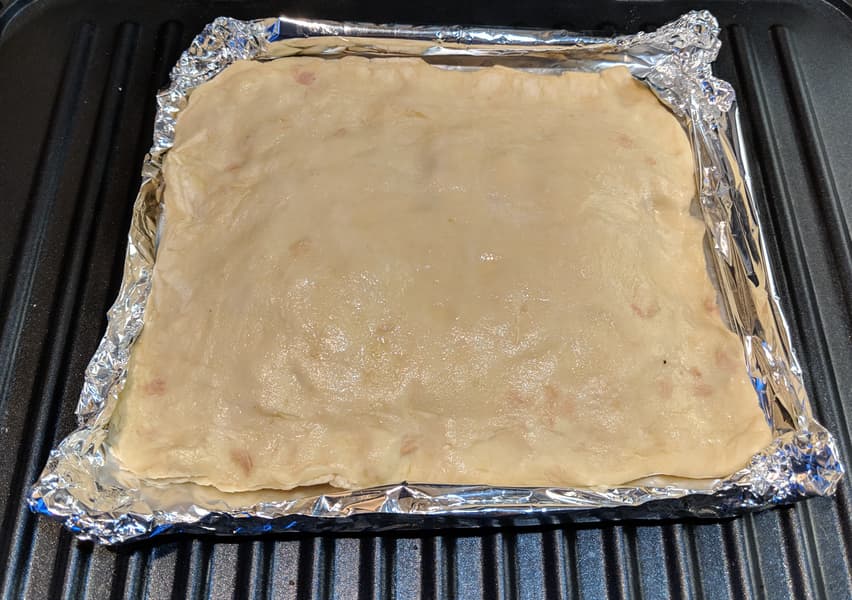 Пирог сверху слегка смазали оливковым маслом и отправили на пластину гриля. В рецепте сказано, что вокруг пирога надо сделать бортик из фольги, иначе слишком сочная начинка может разлиться по всей поверхности гриля. Можно также взять алюминиевую форму, но мы решили поэкспериментировать с бортиком.