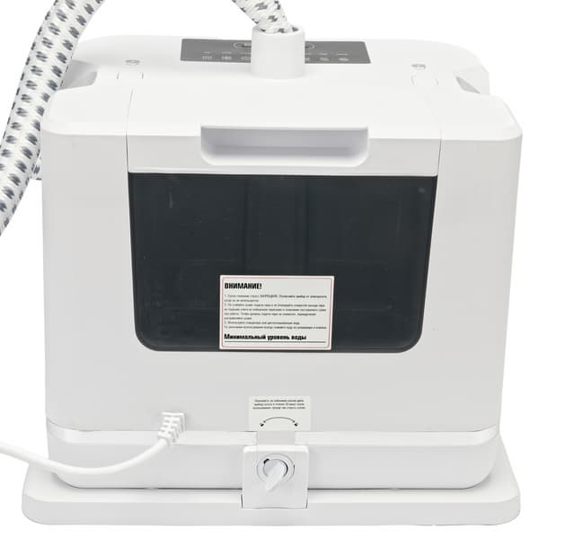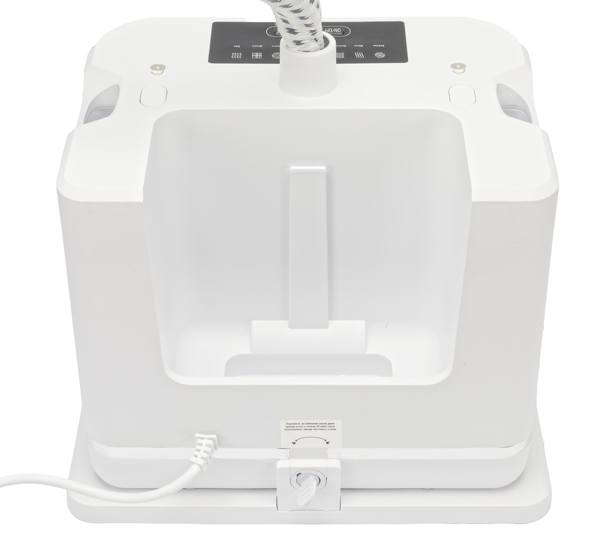 Панель управления, выделенная черным цветом, размещена на верхней грани корпуса. Рядом по центру находится место крепления парового шланга длиной 150 см.