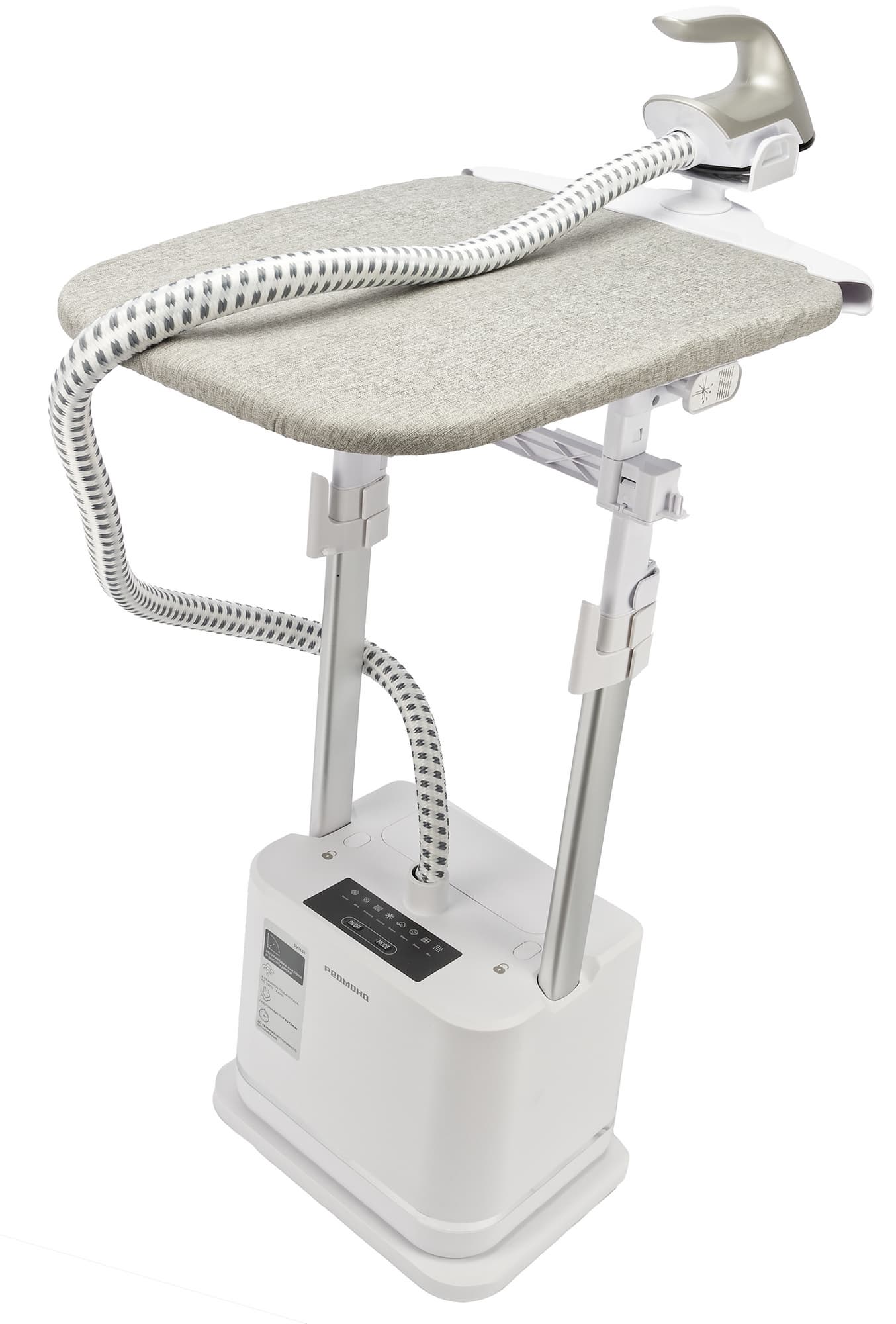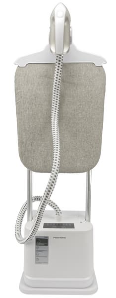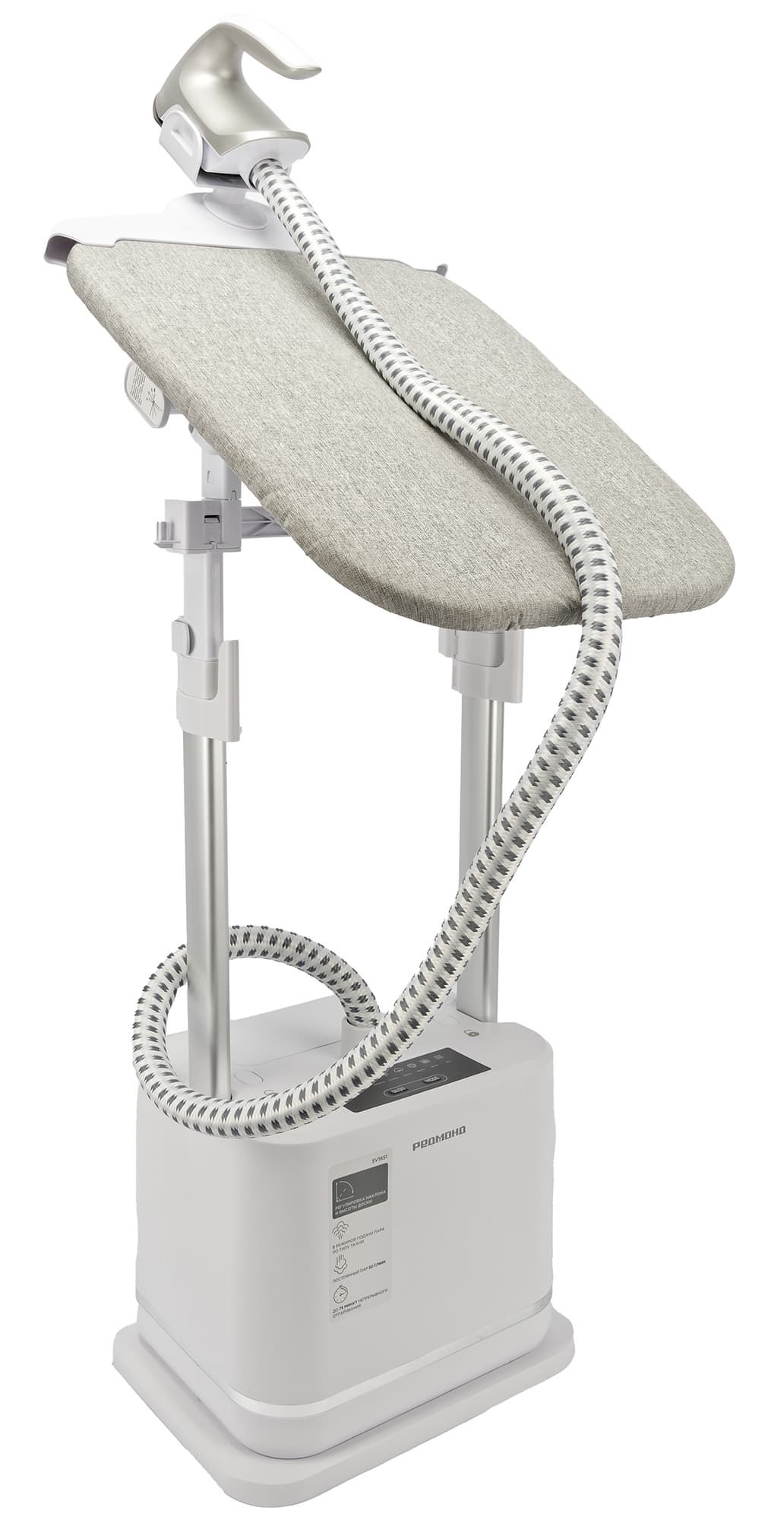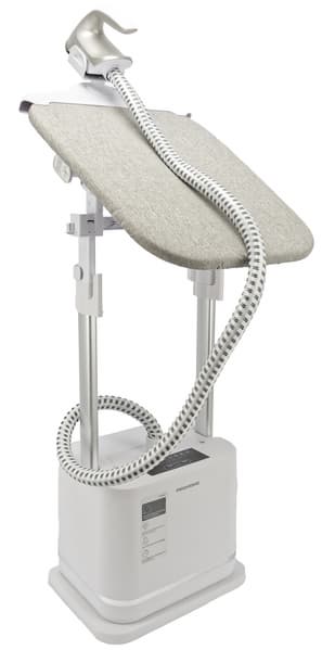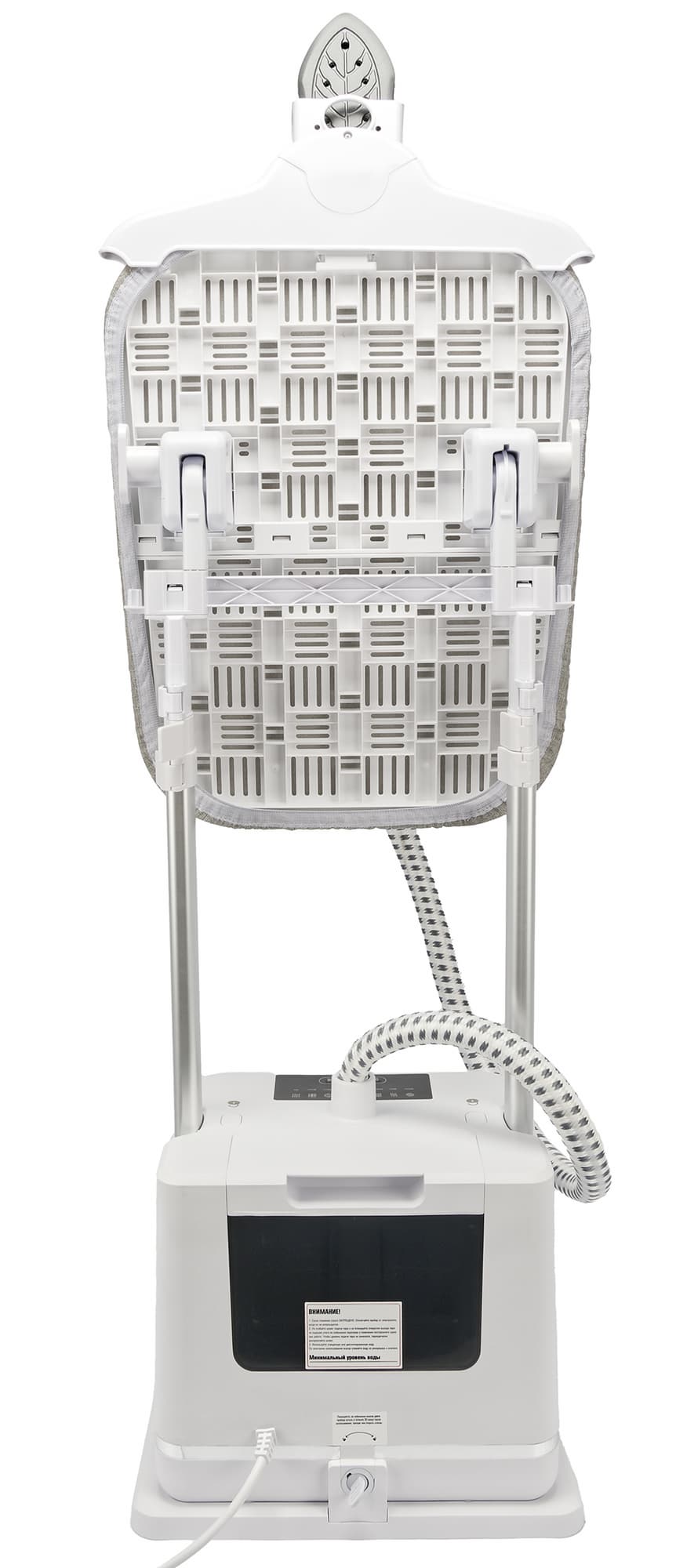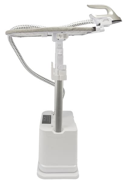 Конструкция прибора оснащена маневренной гладильной доской, которую можно расположить не только вертикально, но и горизонтально или даже по диагонали. Телескопические стойки позволяют регулировать высоту устройства от 100 до 150 см. Вешалка, легкий небольшой утюжок, достаточной длины ненагревающийся паровой шланг и сетевой кабель делают эксплуатацию устройства комфортной. Часто доливать воду в процессе не придется — вместительного 2-литрового резервуара хватает в среднем на 50-60 минут отпаривания. На нагрев прибор тратит в среднем около 30 секунд. Пар в процессе выходит мощным ровным потоком с периодическим недолгим понижением мощности, которое не отражается негативно на скорости обработки изделий.